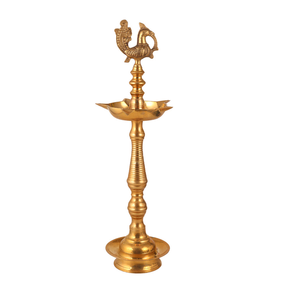 A brass oil lamp with 5 jyots which is a timeless masterpiece crafted to perfection by skilled Indian artisans. This magnificent lamp holds the power to illuminate your surroundings with its enchanting glow. Designed to be lit using either mustard oil or desi ghee and cotton wicks, it effortlessly spreads warmth and radiance. Adorned with a meticulously carved peacock atop, this lamp embodies the elegance of traditional Indian craftsmanship. Its shiny golden finish, coupled with the use of high-quality brass, exudes an irresistible charm, making it a captivating centerpiece for home, office, temple, or even museum displays. Its significance extends beyond decoration, as it finds its place during aarti at temples and as an essential element in Pooja rituals. Delight your loved ones with this extraordinary gift, as it serves as a symbol of prosperity, spirituality, and devotion. Whether for special festivities or auspicious occasions, the Brass Oil Lamp is sure to bring joy, radiance, and a touch of timeless elegance to any setting.