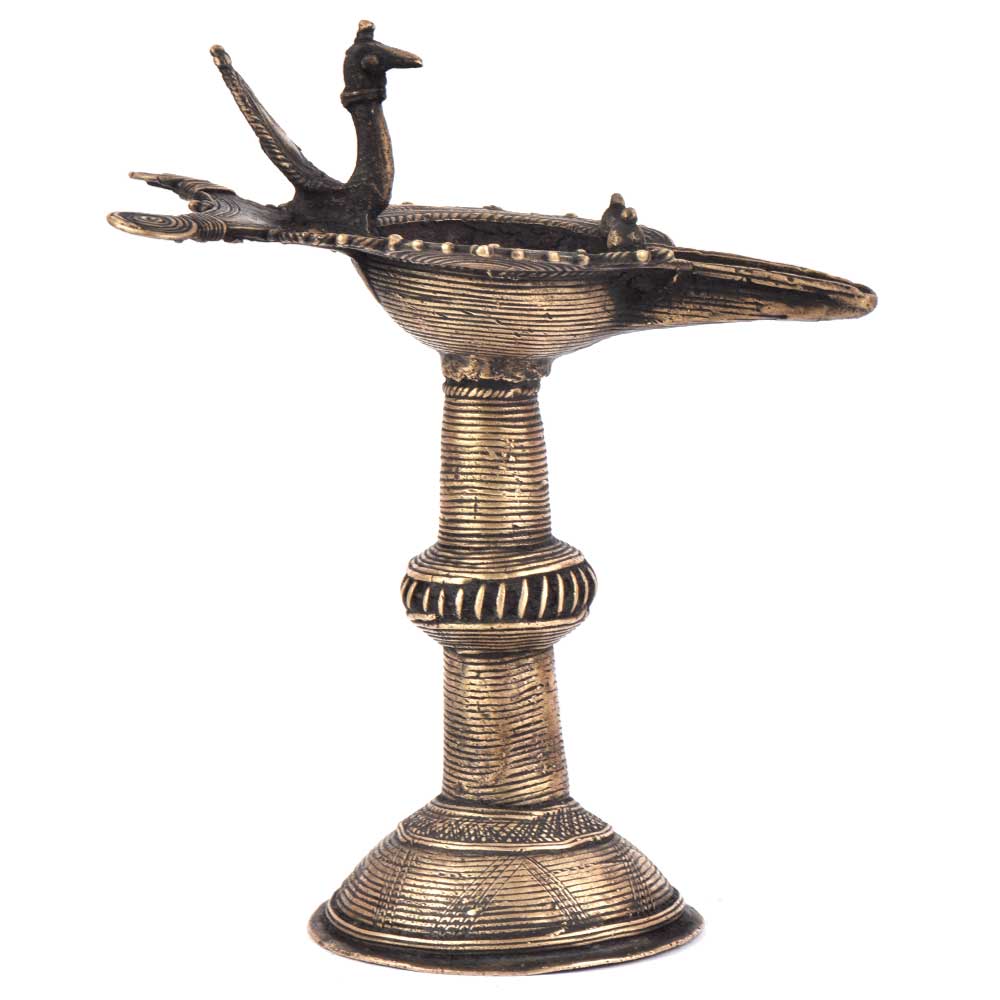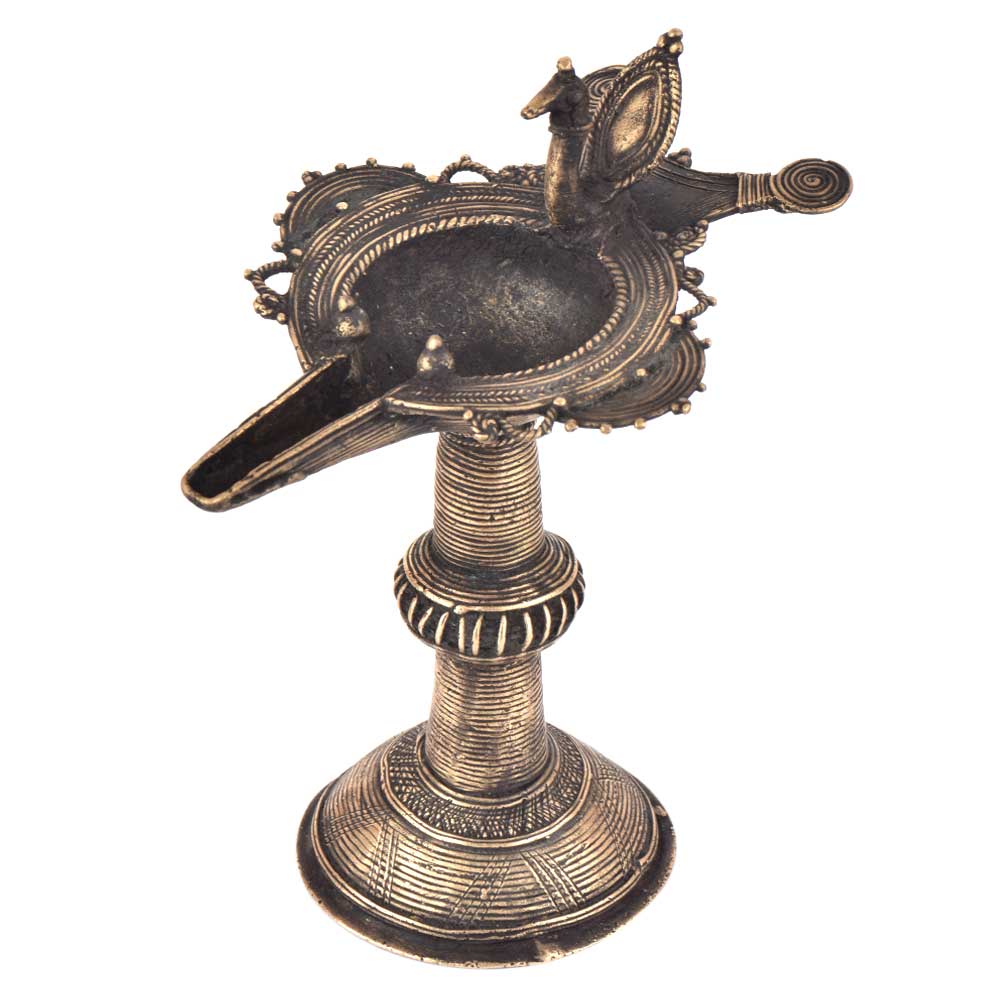 Handcrafted using old lost wax technique primarily practiced in Orrisa and West Bengals by the local or tribal artisans. In this technique the molten wax is poured into desired clay mould and when the wax melts the clay is broken and we get the desired metal object which is further polished to perfection. The Deep Cup Can Be Filled with Oil and Light a Cotton Wick. Diyas/ Oil Lamps are Considered Auspicious as in Hindu Religion. It is detailed with Elephant and Peacock Animals with Beautiful Details.