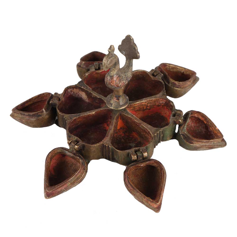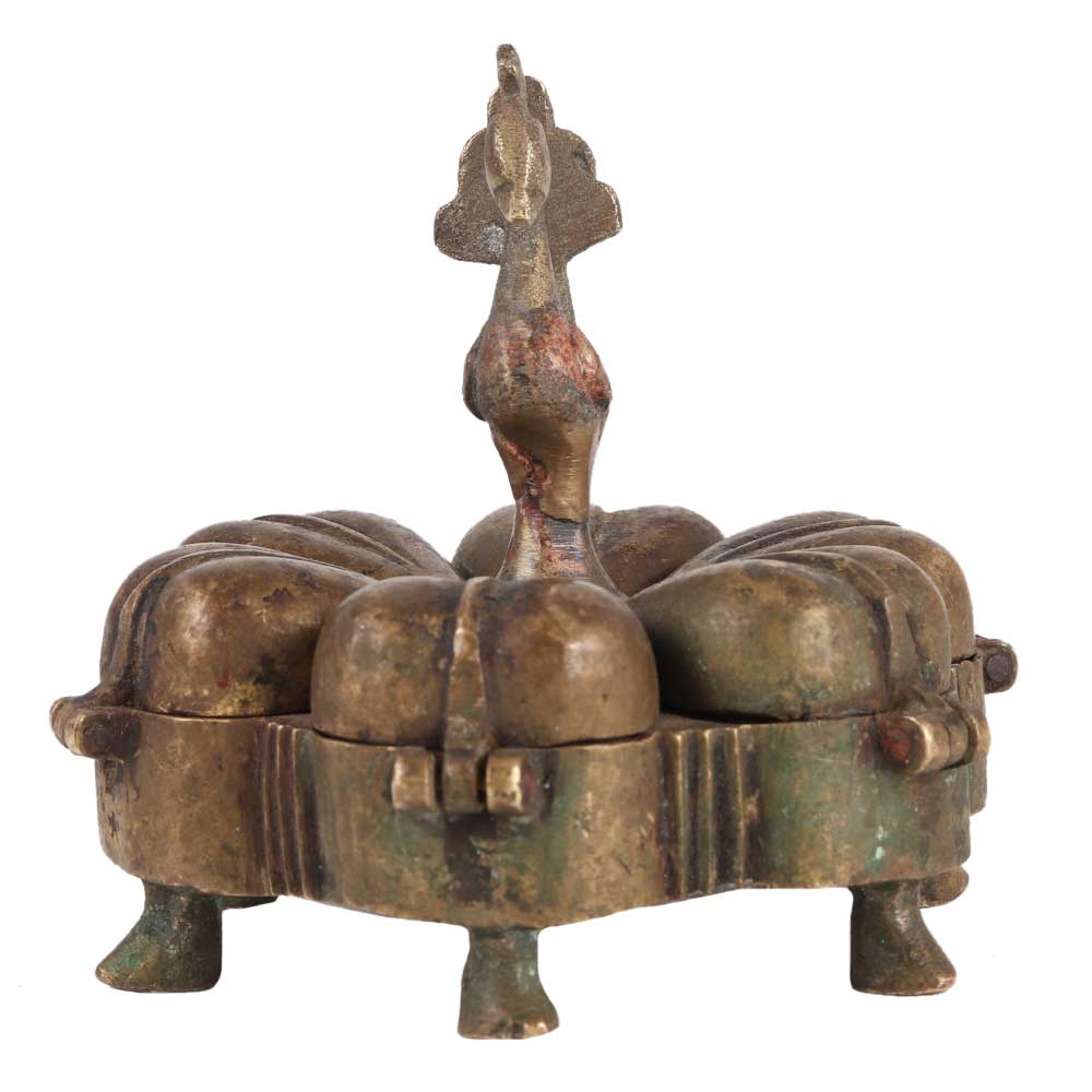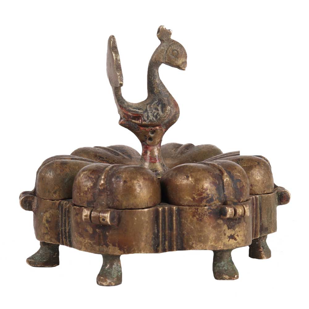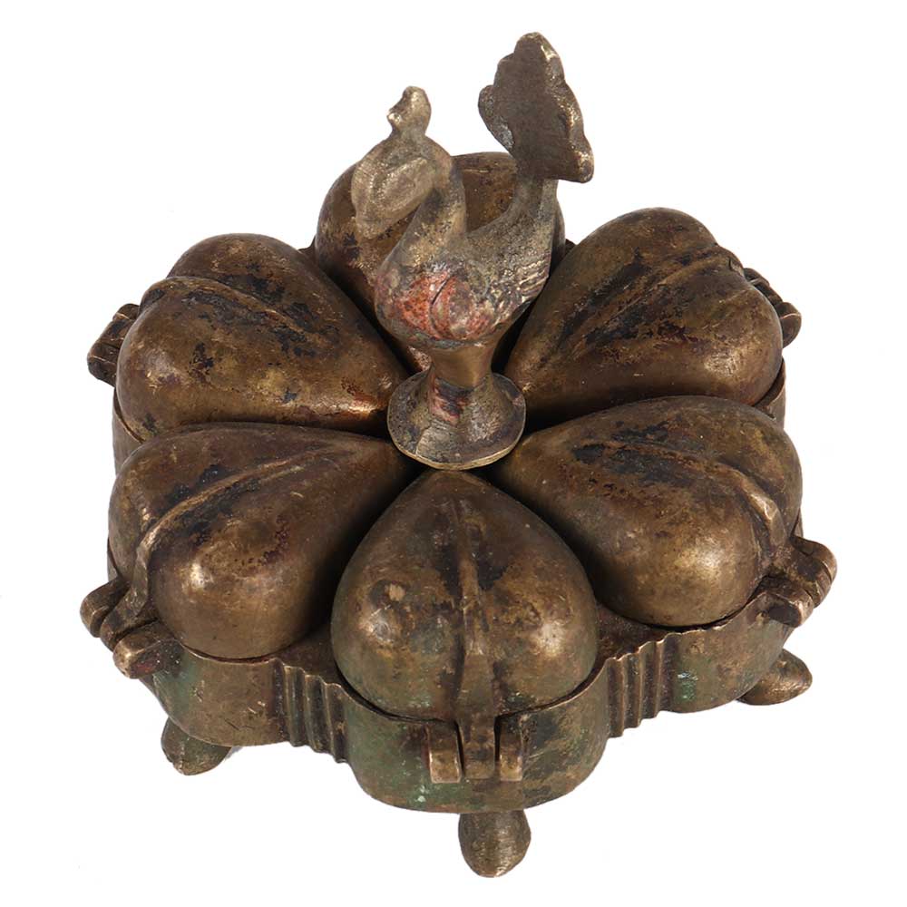 The artisans of india created this exquisite box out of brass. It has 6 compartments and a bird on top. Loosen the bird on top to access each chamber. It is crafted with great accuracy. It used to was used to keep ayurvedic powders, beauty products, seasonings, vermilion, as well as other powders protected. It can also serve as a luxury item.
