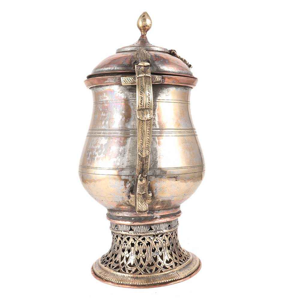 Here is a lovely late nineteenth century hand-chased ornamental water kettle, Tea or Coffee pot. The pot is a samovar, with a tin-lined section for pouring water and an inner chamber for burning wood to boil water, with perforations around the base allowing air to sustain the burning. It is most likely from Persia or Kashmir, and it is made of copper with a brass handle and cap.