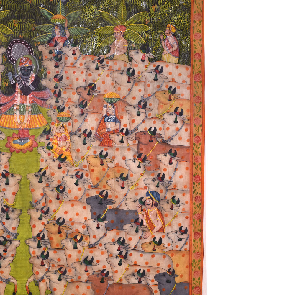 Rajasthan's Pichwai Cow Painting of Shreenathji on Sharad Purnima are a traditional type of art that represent incidents from Lord Krishna's life. One of the most well-known Pichwai paintings depicts Shreenathji, an avatar of Lord Krishna, with cows on the festival of Sharad Purnima. Sharad Purnima is a Hindu holiday held in the month of Ashwin, which falls in October or November. The moon is said to be closest to the earth on this day and to shine brightly. Lord Krishna, according to mythology, used to celebrate this occasion by playing his flute and dancing with the Gopis in the moonlight. This celebration is vividly shown in the Pichwai art of Shreenathji with cows on Sharad Purnima. Shreenathji is seen in the picture standing in the center, surrounded by cows. The backdrop is painted in blue tones to reflect the night sky, and the moon is seen shining brightly. Shreenathji is pictured playing his flute while the cows watch. The artwork depicts the beauty and peacefulness of the occasion and is a visual expression of Shreenathji's intimate affinity with the cows. Cows are revered in Hindu mythology and are considered sacred creatures. They are thought to symbolize motherly love, selflessness, and purity. The cows in the Pichwai picture of Shreenathji with cows on Sharad Purnima are completely dedicated to Shreenathji and are attentively listening to his singing. Finally, the Pichwai cow painting of Shreenathji on Sharad Purnima is a lovely depiction of the event and the close link between Shreenathji and the cows. The picture depicts the moment's beauty and tranquillity and serves as a reminder of the value of love, devotion, and nature in Hindu philosophy.
