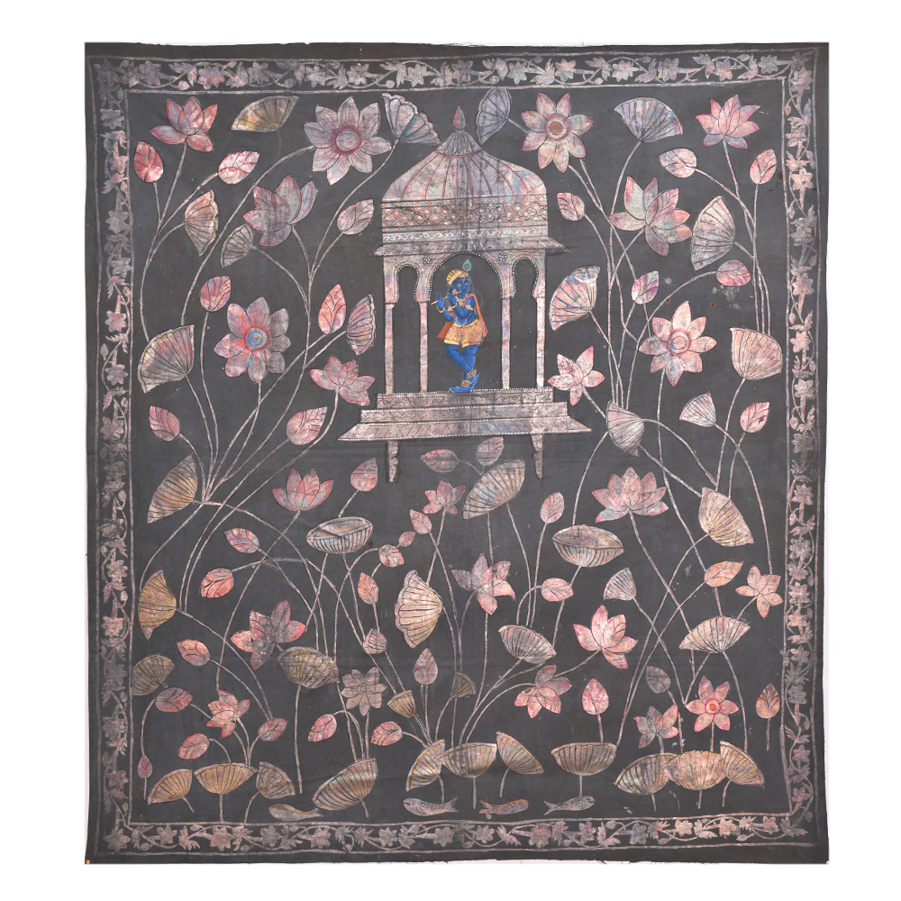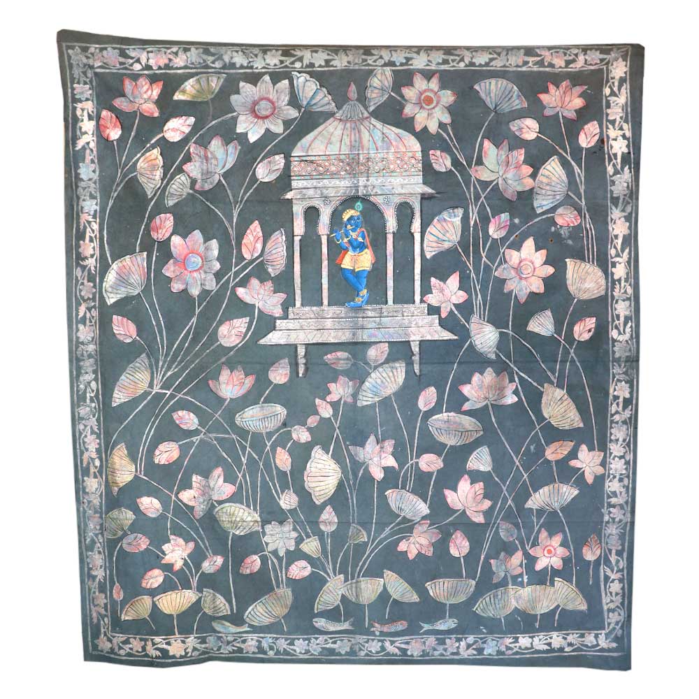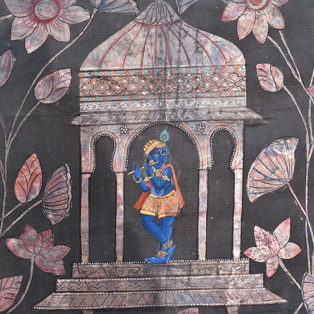 Pichwai Painting Of Lord Krishna on a black cloth. The painting shows Lord Krishna playing Flute with floral background made by the local painters using natural colors. Home Decor, Office, Shops, Showroom, Gifting, Return Gifts, Decorative. This is the best gift for your near and dear ones.