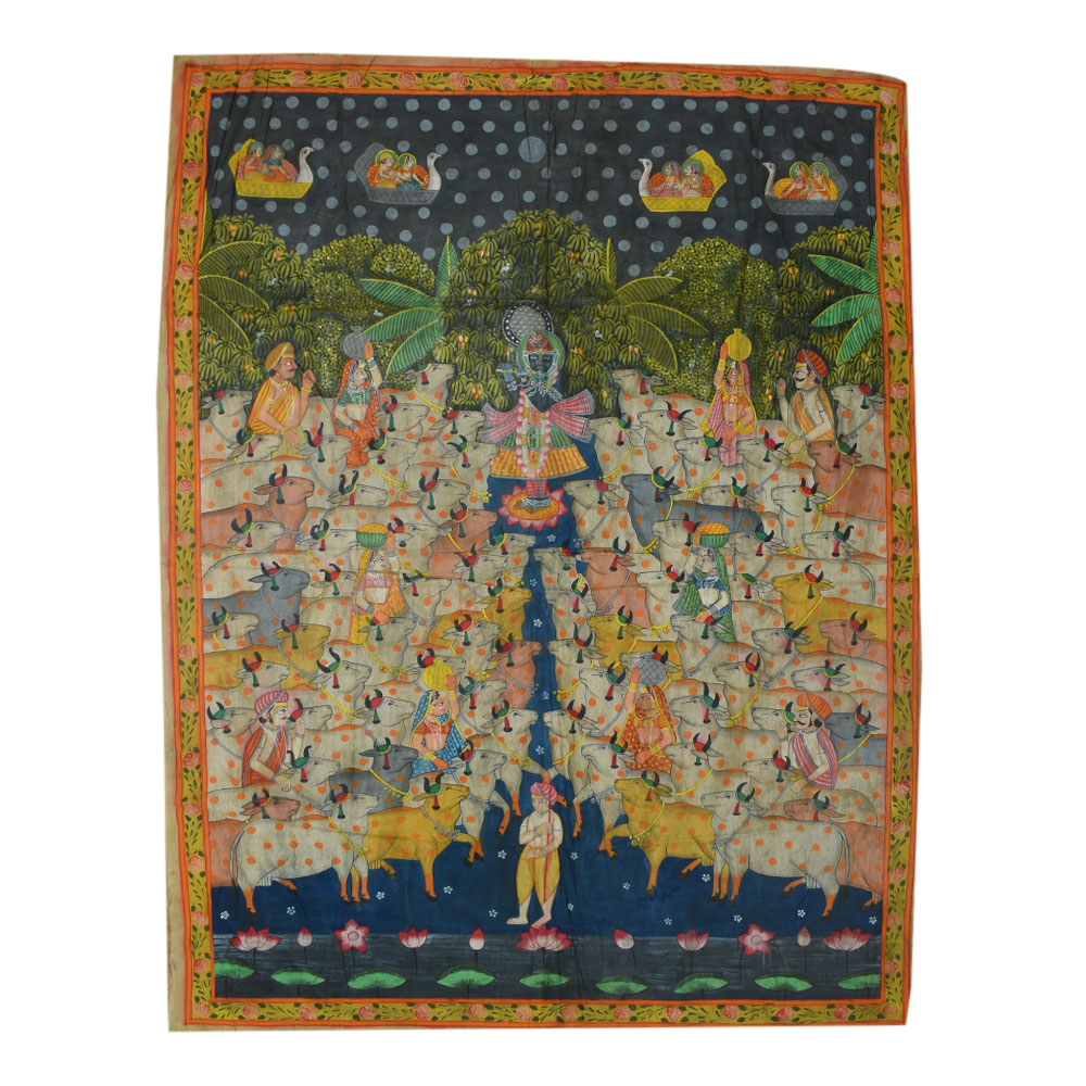 Shrinathji, magnificent in all his chaubis swaroop is seen at manorath a special service held during the Gopashtami festival to commemorate Lord Krishna's transformation into a full-fledged cowherd. Shrinathji is seen in the pichwai wearing a crown and a specially embellished skirt for the occasion.