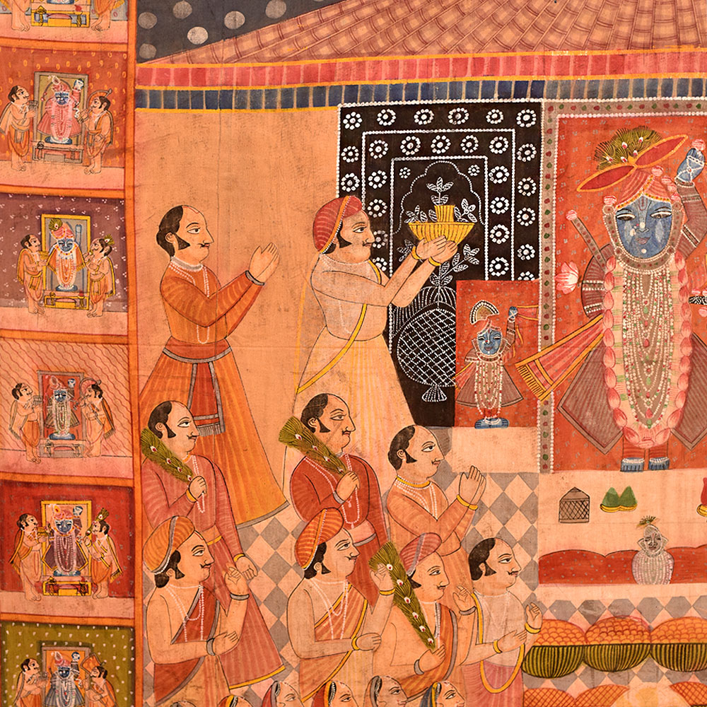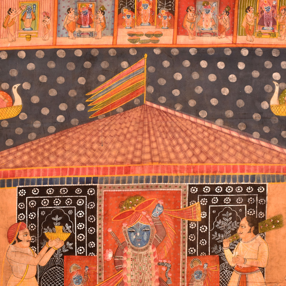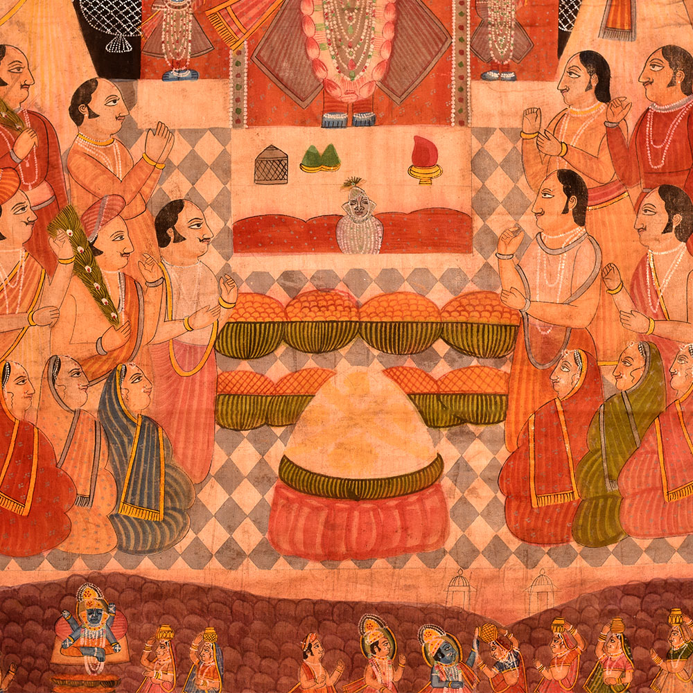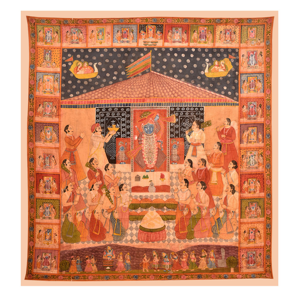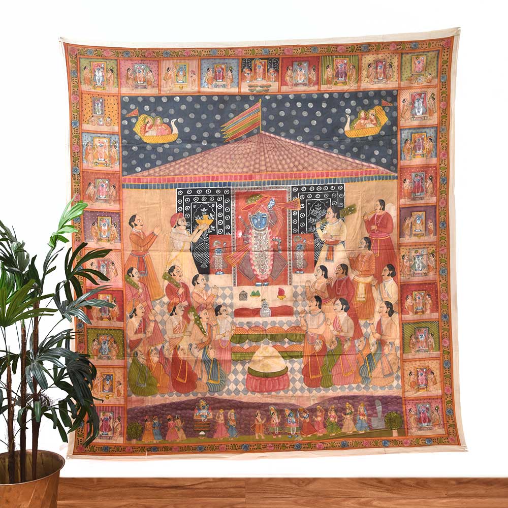 Pichwai Painting Of Sreenathji Annakut Festival is a distinct and lively art style developed in Rajasthan's holy town of Nathdwara. Annkut, or Annakut, is a Hindu festival that marks the beginning of the Hindu New Year. It is a day of offerings and feasting, with the making of Annkut paintings being one of the most prominent components of the celebration. Lord Krishna, also known as Shrinathji, is generally shown in various shapes and attitudes in Shrinathji Annkut paintings. They are distinguished by complex features and vivid colours, and they frequently depict representations of fruits, vegetables, sweets, and other culinary items donated to the god during the festival. Shrinathji Annkut paintings are famous for adorning homes, temples, and other holy venues due to their brilliant colours and meticulous detailing. These are frequently presented during the Annkut festival to show thanks and devotion to Lord Krishna. Shrinathji Annkut paintings are valued as works of art in addition to their religious importance. Several artists have altered the classic shape to produce new and unique creations that integrate contemporary methods and styles. Although keeping the core of the traditional form, these recent Annkut paintings frequently contain abstract motifs and vivid colour combinations.