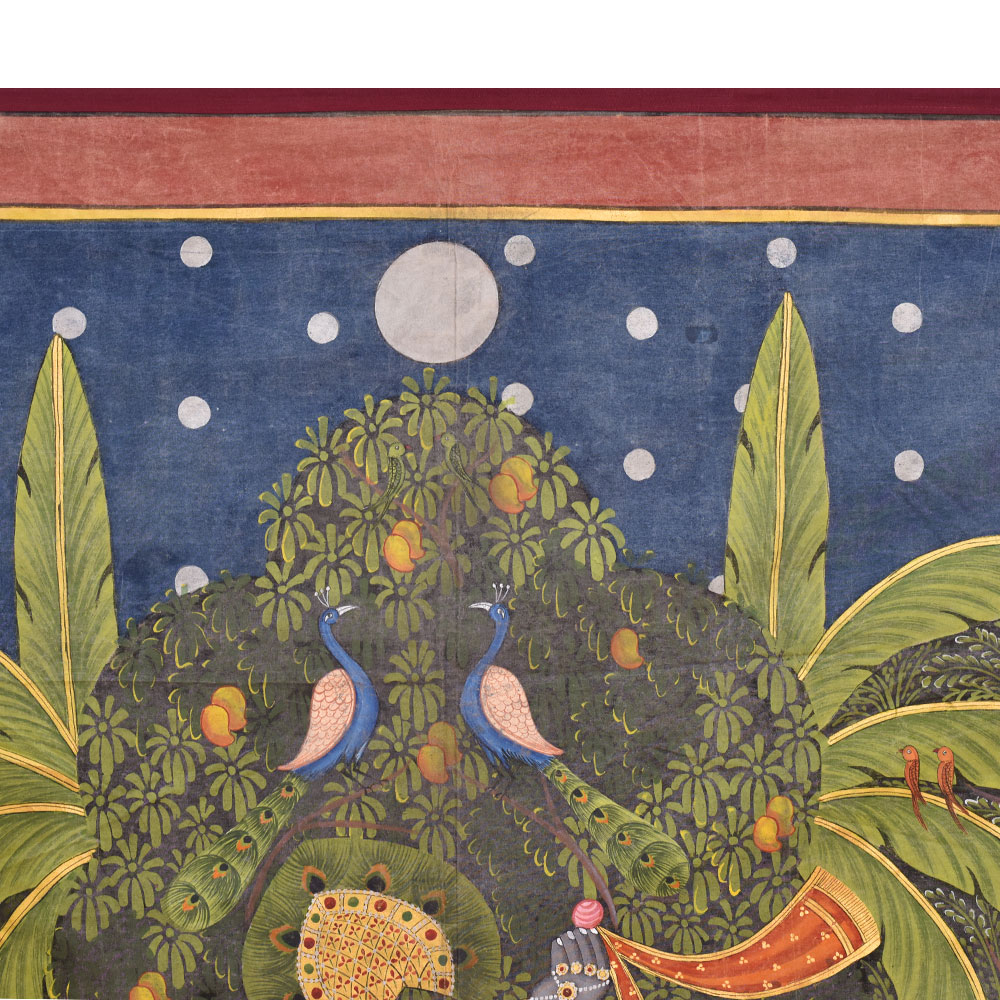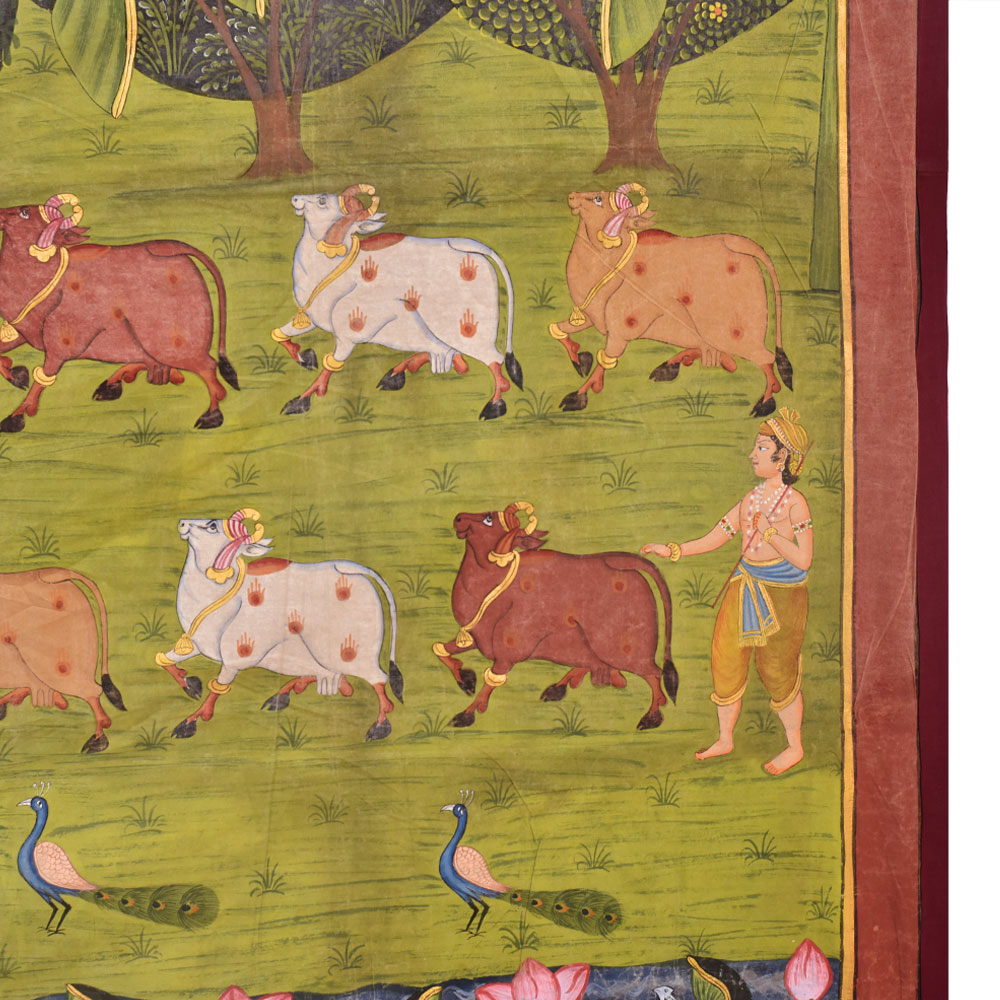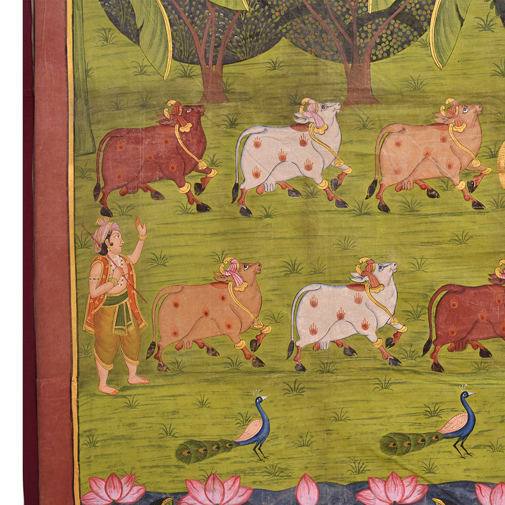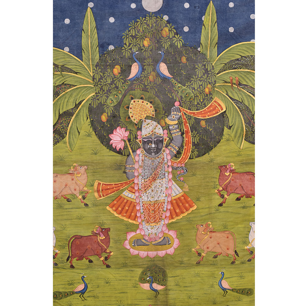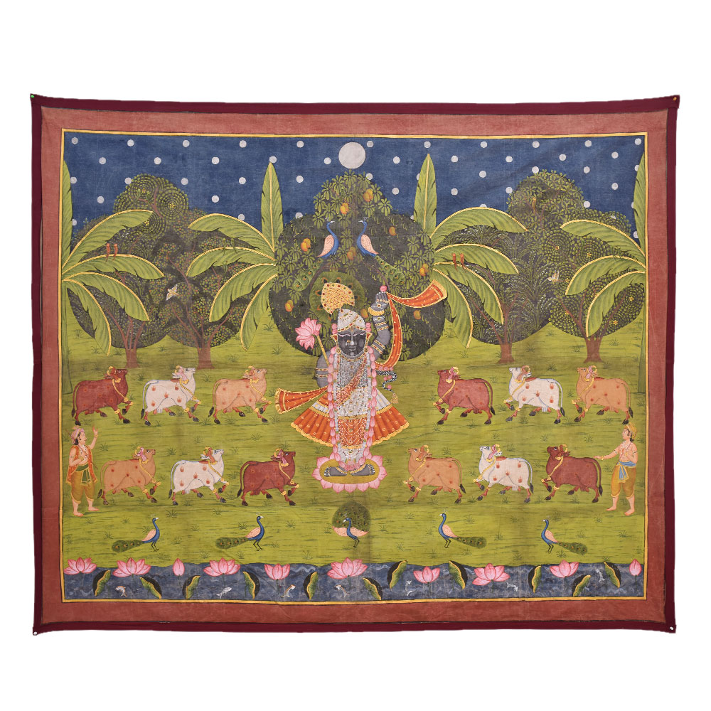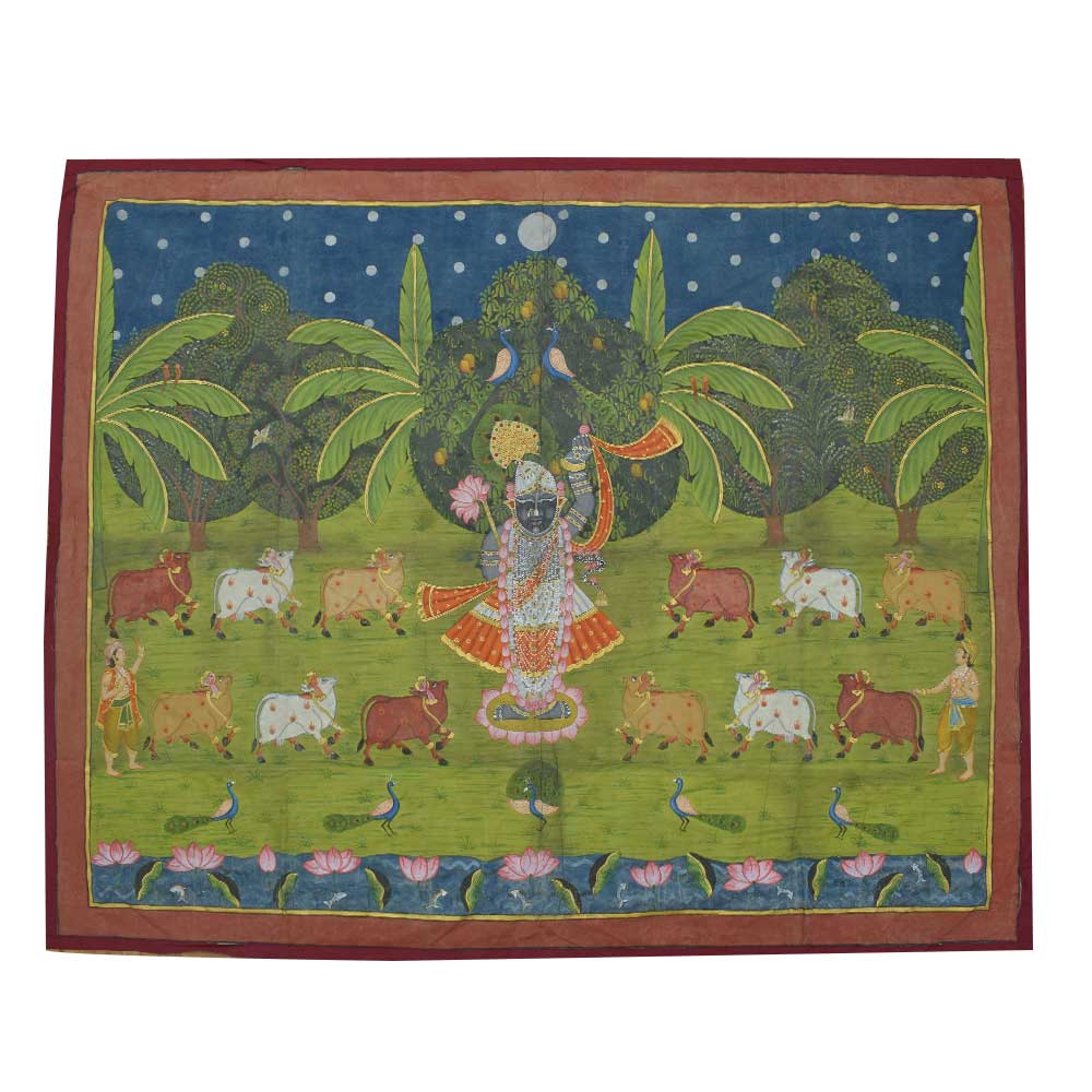 Shrinathji, the deity manifested as a seven-year-old kid, is represented as Lord Krishna in Pichwai's. You can give this to a family member or a friend as a present. As shown in the image the painting contains multiple shapes of particular figures. You may add a good set of lights to the area where the painting is displayed and the decor will give the space a new feel and aspect.