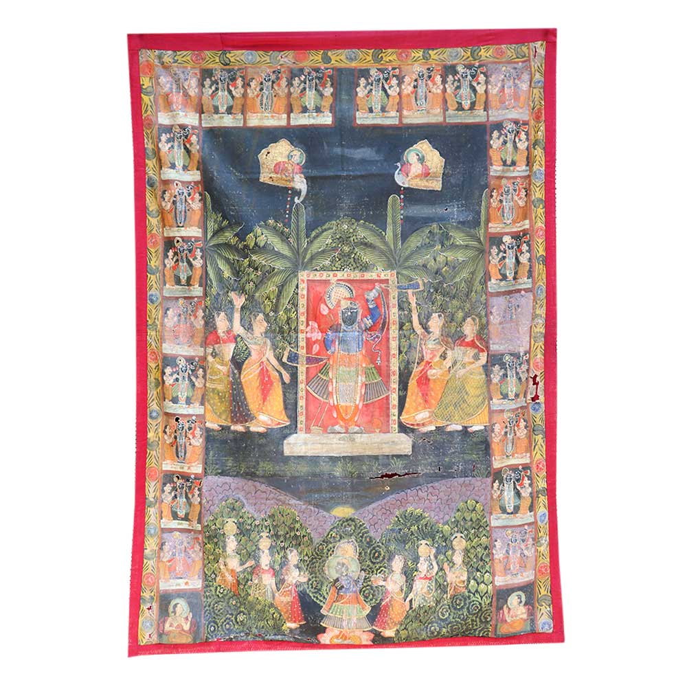Sreenathji Pichwai Painting in a traditional attire holding his favourite flower, Lotus. This painting is created by devotee-artists of Nathwara. Lord SreenathJi Pichwwai Painting is a very popular wall decoration for home, hotel and lobby decoration, temple decoration, conference hall, resort , Diwali gift, house warming gift and stage decoration.