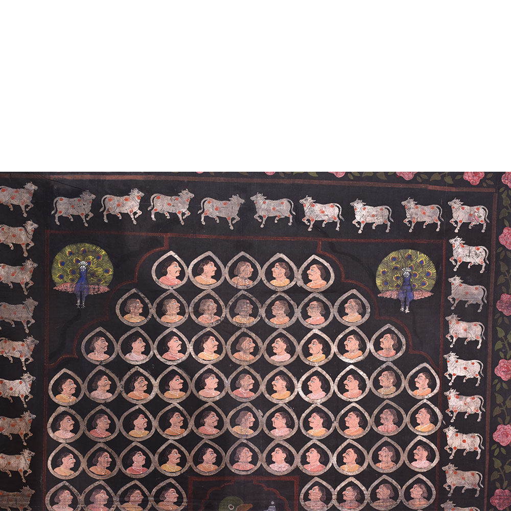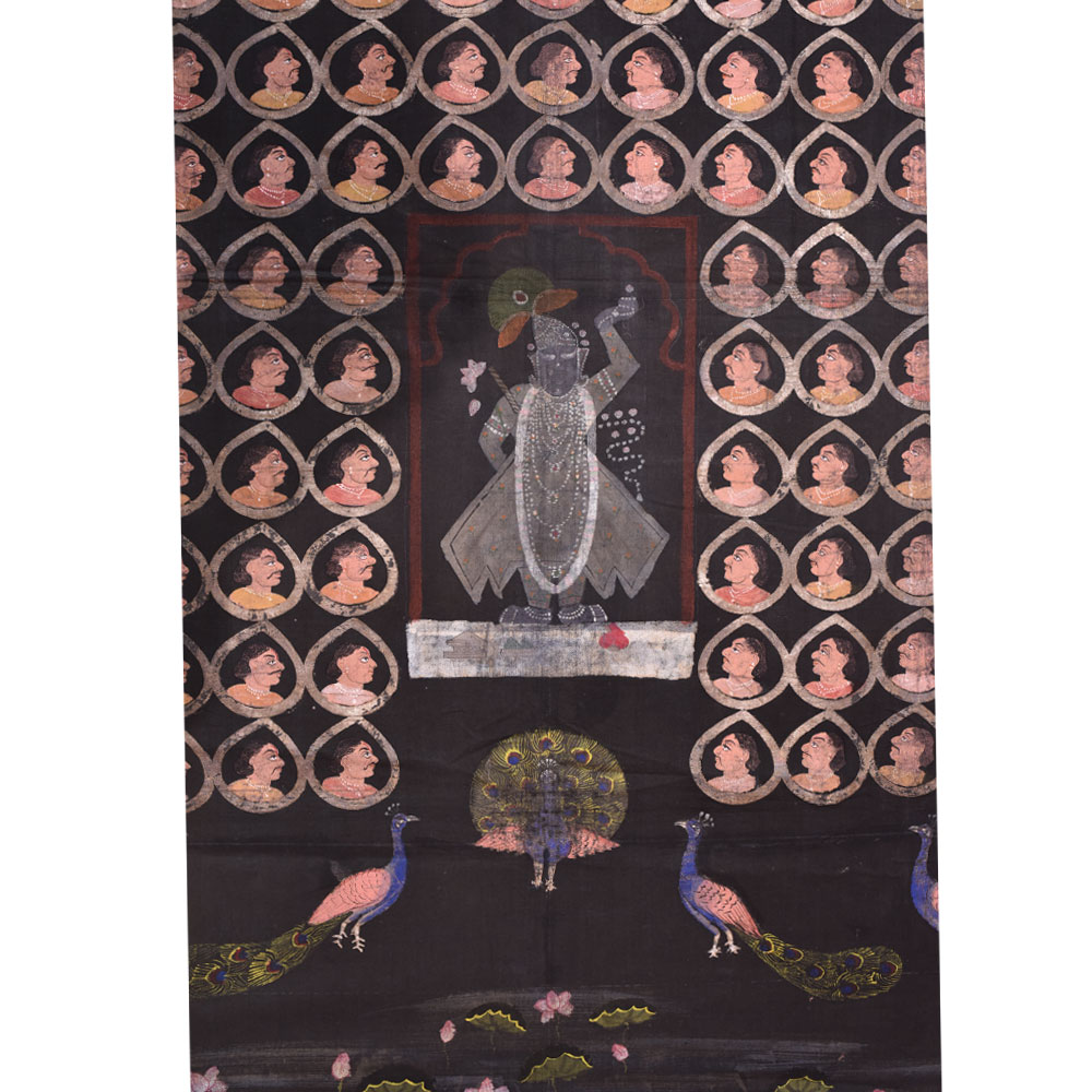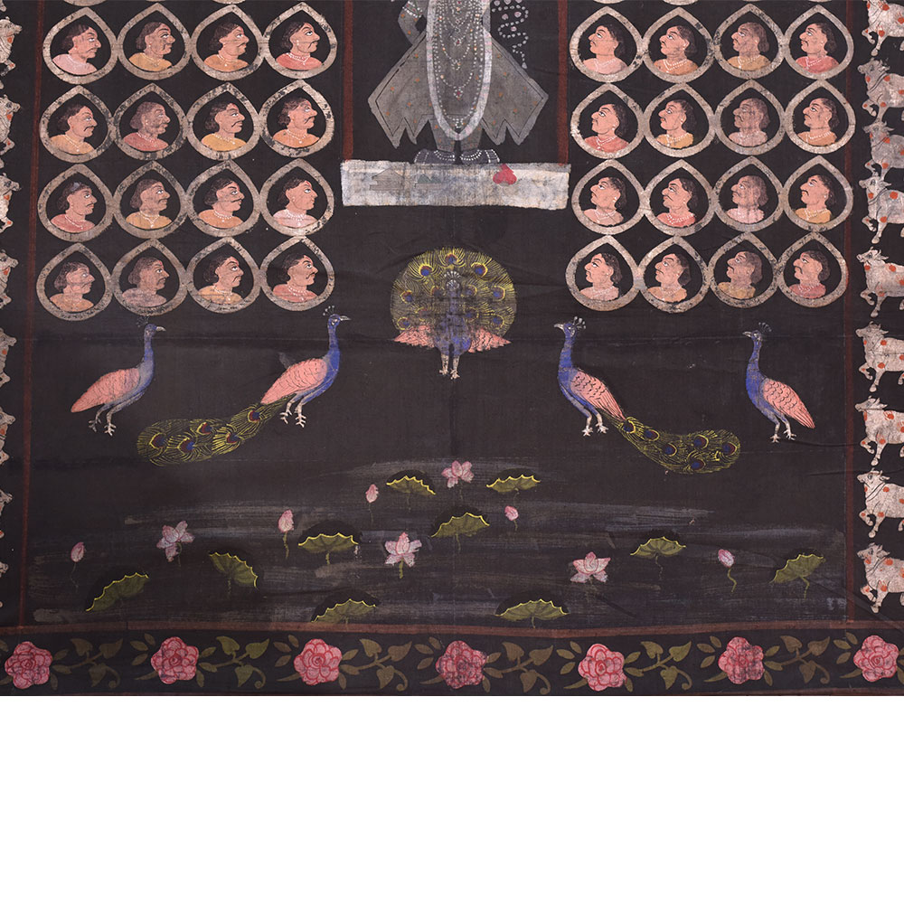Sreenathji Pichwai on black cloth with face motifs is created by devotee-artists of Nathwara a very popular wall decoration for his home, hotel and lobby decoration, temple decoration, conference hall, resort , Diwali gift, house warming gift and stage decoration.