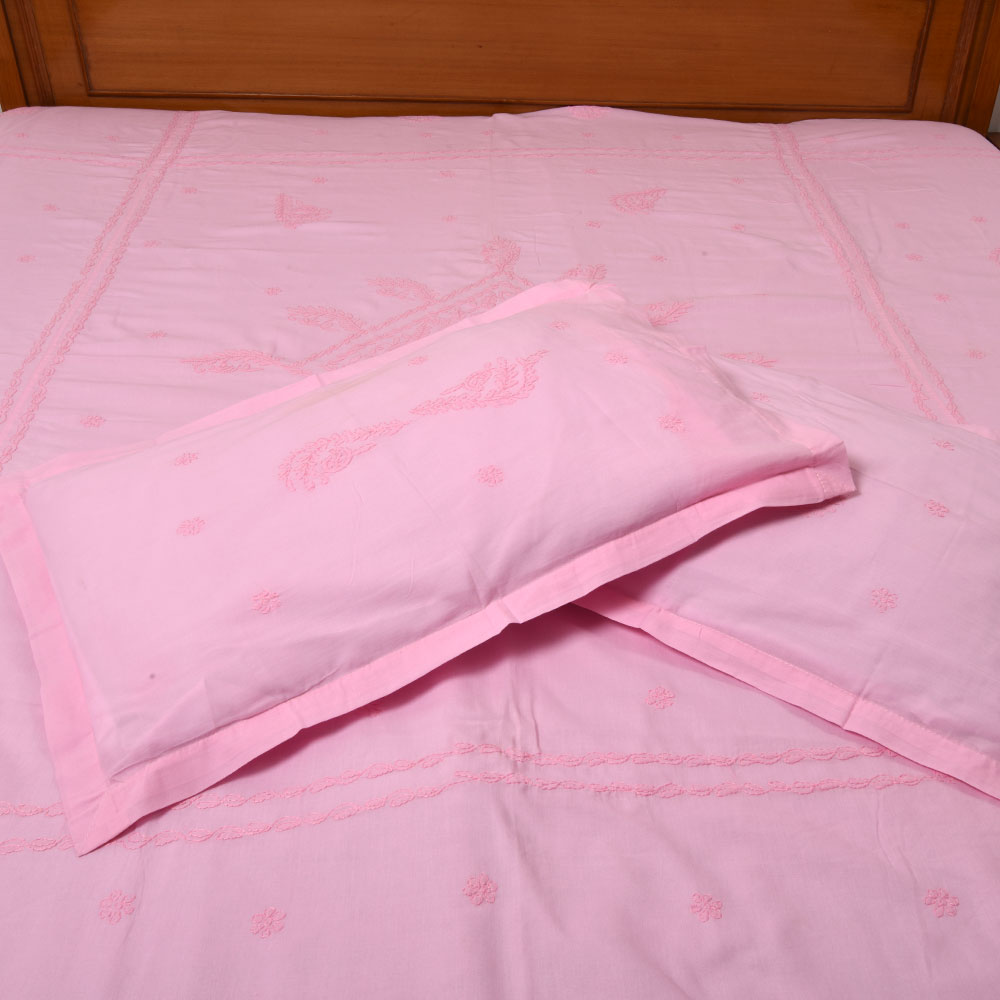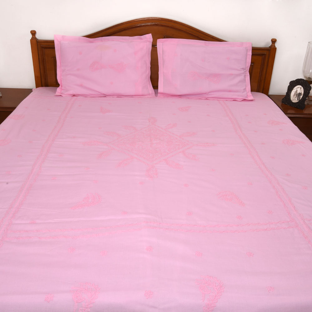 Pink cotton chikankari Embroidered Pink Bedcover. Hand crafted supporting eye capturing designs and colours.