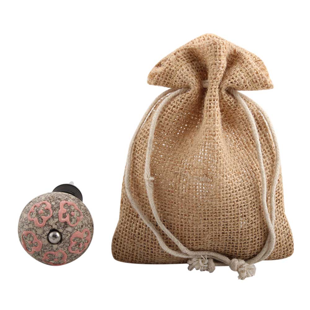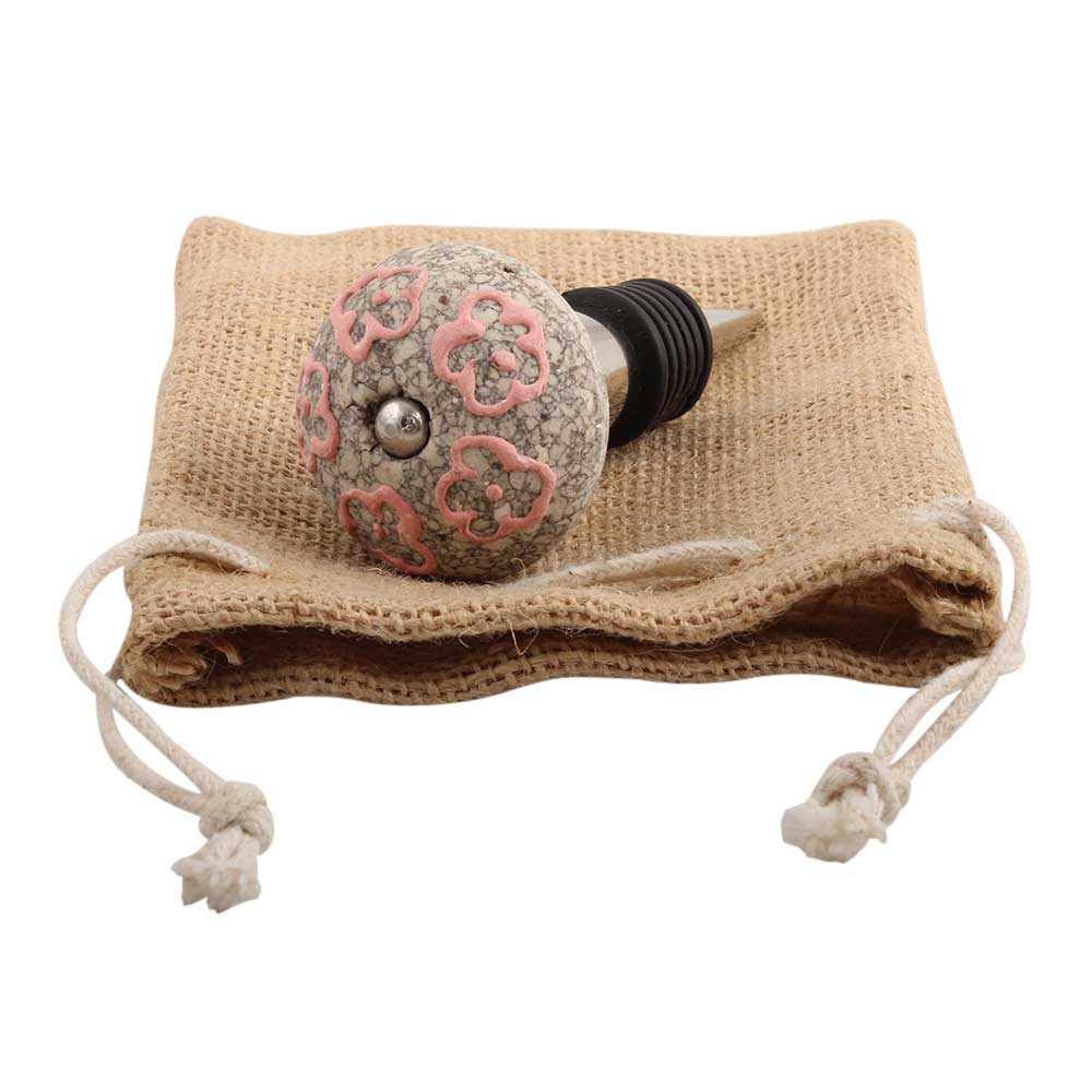 Pink Floral Crackle Ceramic Wine Stopper. Zinc Alloy Wine Bottle Stopper with Attractive Jute Bag Packaging.