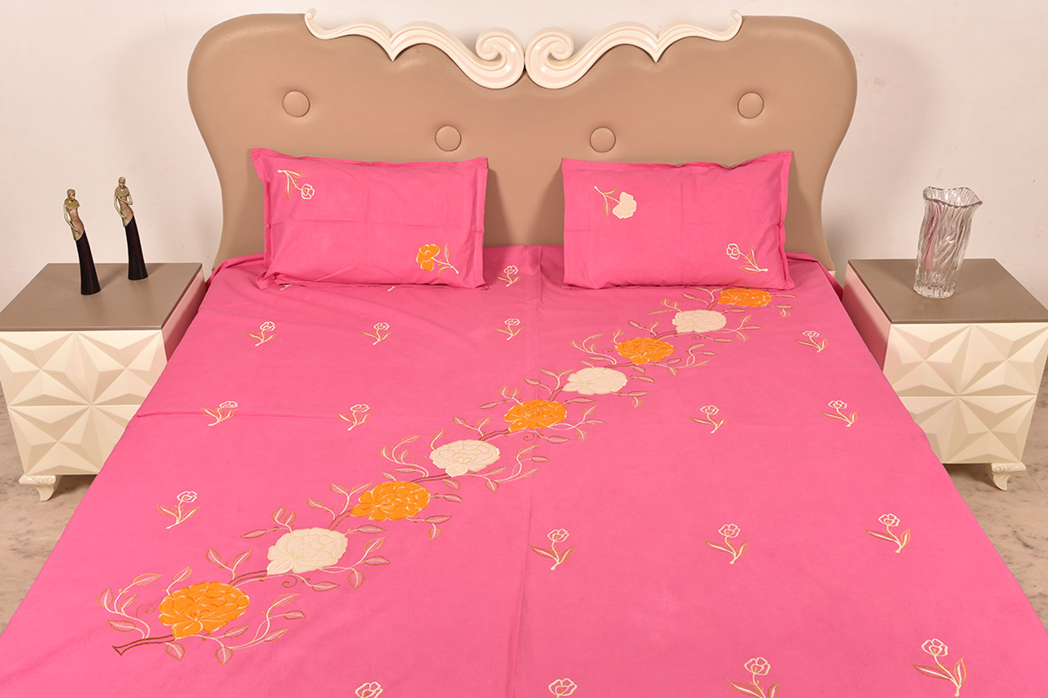 Pink Bed Linen with Yellow & White Floral Design . Hand crafted supporting eye capturing designs and colours.