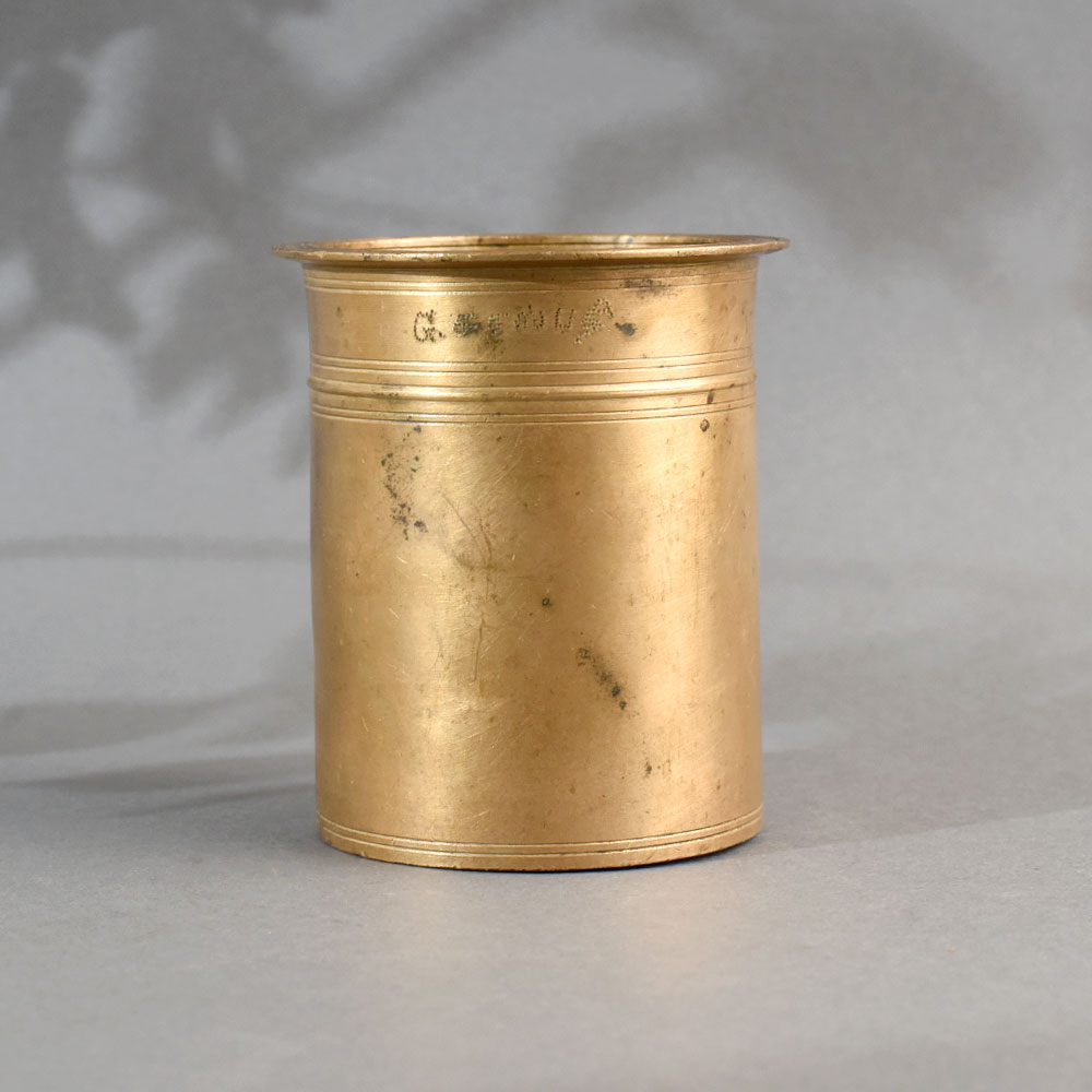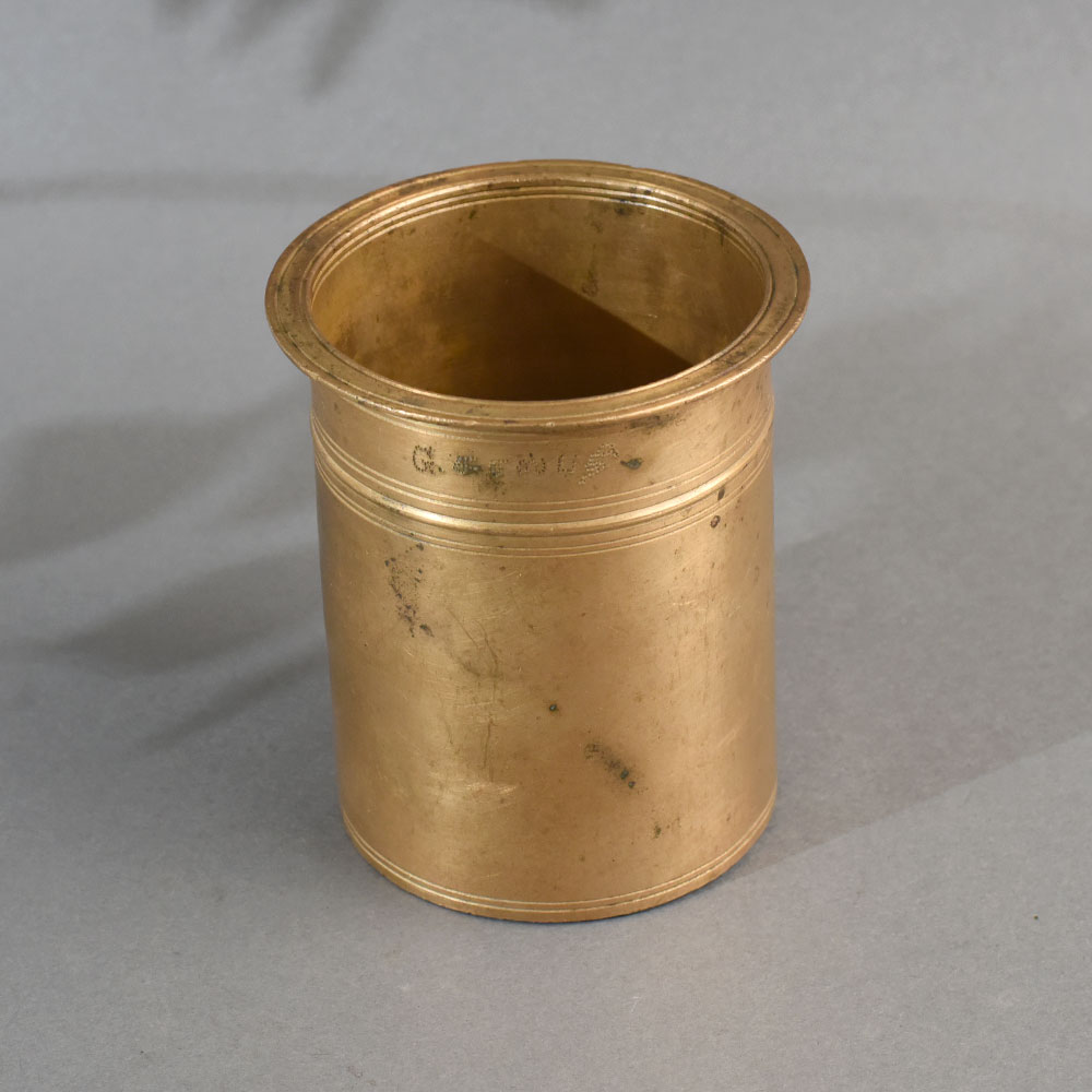 • Design: Cylindrical form with a flared rim and subtle double-line engravings.