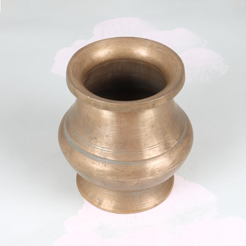 Immerse yourself in the captivating world of South Indian art with our exquisite vintage brass holy water pot. Crafted with meticulous attention to detail by skilled artisans, this stunning piece is a testament to the region's rich cultural heritage and enduring artistic traditions. Featuring a solid brass construction and a plain brown finish, this holy water pot emanates a timeless, understated elegance that will seamlessly blend into a variety of decor styles. Use it as a striking vase to showcase your favorite blooms, transforming it into a captivating floral centerpiece. Or, embrace its traditional purpose and fill it with holy water, imbuing your home with a sense of spiritual serenity and cultural significance. Whether you're a collector of fine art, a lover of all things vintage, or simply seeking to add a touch of exotic charm to your space, our vintage brass holy water pot is the perfect choice. Invest in a piece that not only beautifies your surroundings but also tells a story of centuries-old craftsmanship and cultural richness. Elevate your home with the allure of South Indian artistry, and let this stunning brass pot become a cherished addition to your space.
