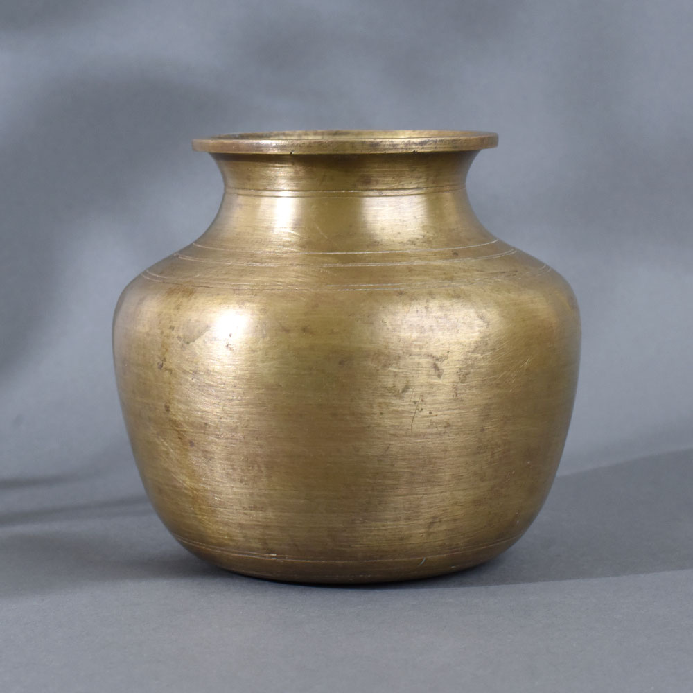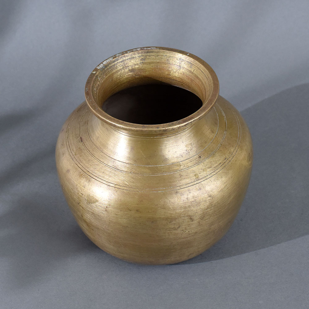 This exquisite brass holy water pot is a fine example of traditional South Indian craftsmanship, used in sacred rituals and spiritual ceremonies. Handcrafted from high-quality brass, this vessel—often referred to as a kalash or lotta—symbolizes purity and is typically used to hold water or other sacred liquids during pujas and temple rituals. Its rounded belly and gently tapering neck with a wide rim reflect the classic Dravidian design style. The golden brass surface has a soft, aged patina, enhancing its antique appeal while signifying its spiritual significance. Whether used in religious functions or as a decorative accent, this pot brings a sense of calm and tradition to any space. Perfect for collectors of Indian antiques or practitioners of Vedic rituals, this brass holy water pot serves both aesthetic and spiritual purposes.