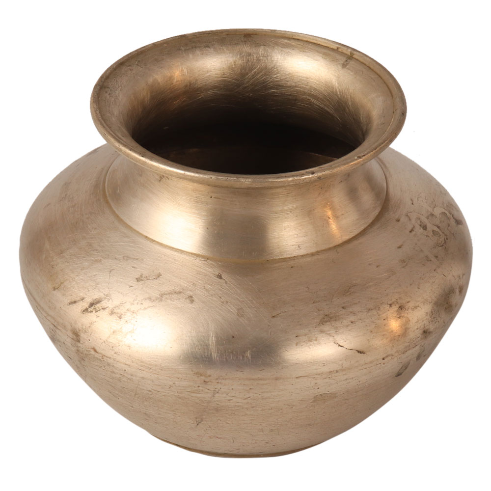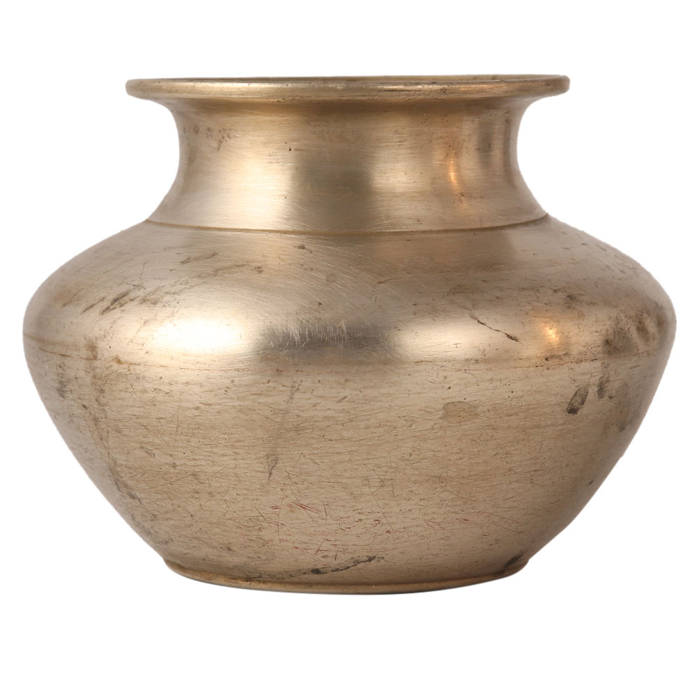 A plain used water pot for Hindu rituals, weddings and other auspicious occasions. It has a vintage look with a flat bottom to hold on the surface. It is carved from a white metal alloy and is superbly crafted. Hindus often use it to hold sacred water from the river Ganga. A perfect piece for your collection.