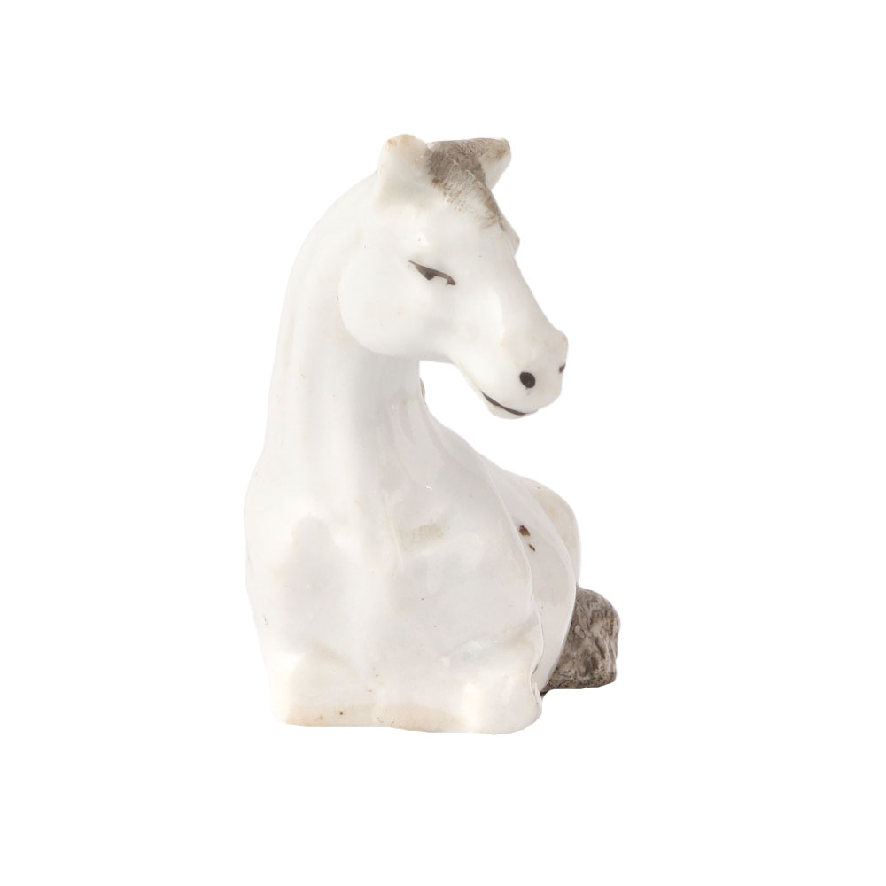 Sweet statue of a foal or young horse made of solid brass. It has a cute appearance with large ears, eyes, and a mane with texture. Its legs are long and thin. It is dozing off. With the exception of the black detailing on the mane and tail, it is all-white. You can decorate with it. a wonderful present for equestrians.