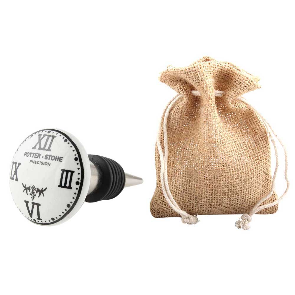 Potter Stone White Flat Ceramic Wine Bottle Stopper. Zinc Alloy Wine Bottle Stopper with Attractive Jute Bag Packaging.