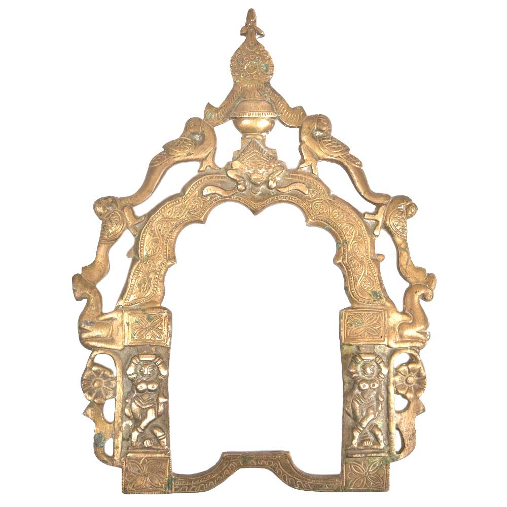 Handmade brass Prabhavali is the ideal temple décor and is used to decorate the idol of god or goddesses and placed as a temple or prayer accessory.The prabhavali small peacocks on the top of the arch and two female statues on the pillatr of the arch .