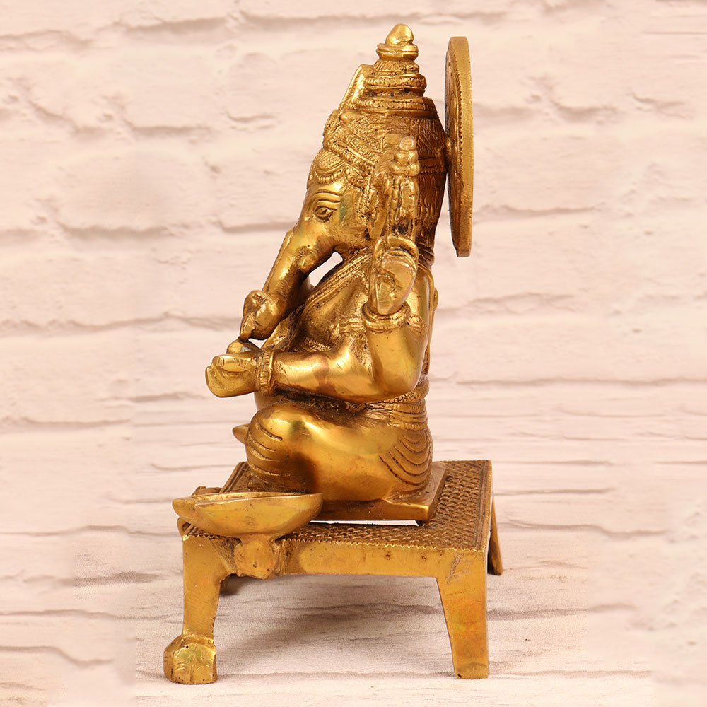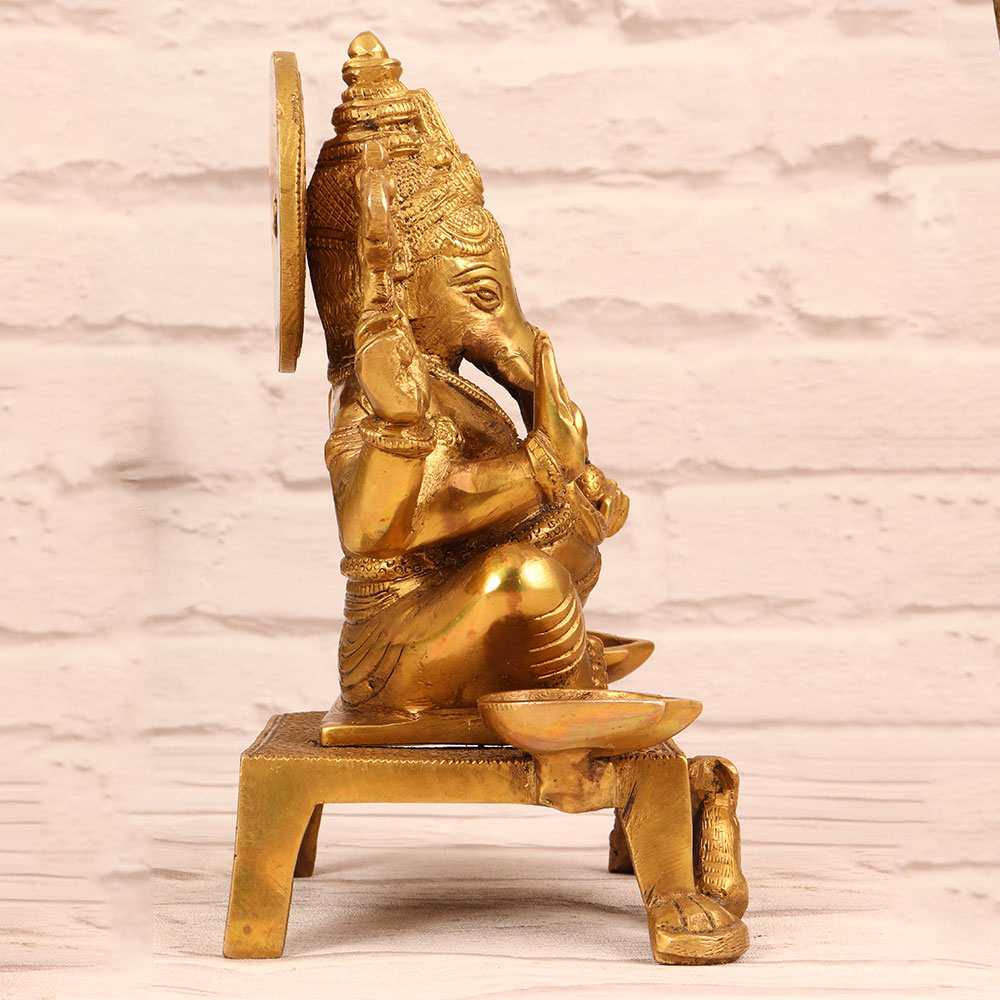 This Brass Lord Ganesha Statue is a divine masterpiece crafted with precision by highly skilled Indian artisans. Seated gracefully on a table, this enchanting creation radiates timeless elegance with its antique brown finish. Made from high-quality brass, every detail of Lord Ganesha's form is meticulously handcrafted, showcasing the artisan’s dedication to their craft. Lord Ganesha, revered as the remover of obstacles and the symbol of wisdom, prosperity, and good fortune, brings a sense of divine presence to any space. The statue depicts Ganesha in a sitting position, accompanied by his vahana (vehicle), Mushak (the mouse), symbolizing humility and loyalty. This splendid creation is versatile, fitting seamlessly into various settings such as homes, offices, restaurants, hotels, or cafes, especially in prayer rooms where it serves as a source of spiritual inspiration. The antique brown finish adds a touch of antiquity, making it a captivating piece of art. Moreover, it makes for a thoughtful and meaningful gift for your family, friends or relatives on special, festive, or auspicious occasions, symbolizing blessings and positive energy. Embrace the divine aura of Lord Ganesha with this handmade brass statue, an embodiment of craftsmanship and spirituality.