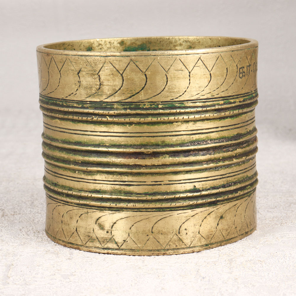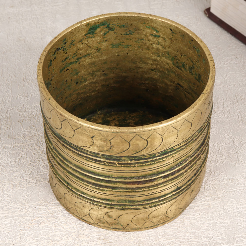 A Vintage Brass Measurement Bowl which is a timeless piece that transcends eras and cultures. Crafted with precision by highly skilled and experienced Indian artisans in the intricate South Indian Art style, this bowl is not merely a functional kitchen item but a piece of history and art. Made from high-quality brass, the bowl boasts an antique brown finish that adds a touch of nostalgia to any space. Its engraved detailing showcases the craftsmanship of artisans who have meticulously preserved traditional techniques. Originally used for measuring rice and dal in the culinary pursuits of generations past, it now finds a new purpose as a stunning indoor flower pot. This versatile bowl seamlessly transitions between the realms of the kitchen, home, office, restaurant, hotel, or cafe. Its unique design and antique allure make it a captivating addition to any vintage collection, and it serves as a thoughtful and meaningful gift for your family, friends or relatives on special, festive, or auspicious occasions. Indulge in the charm of yesteryears and bring a piece of Indian heritage into your life with this handmade masterpiece, a true testament to the enduring legacy of craftsmanship and elegance.