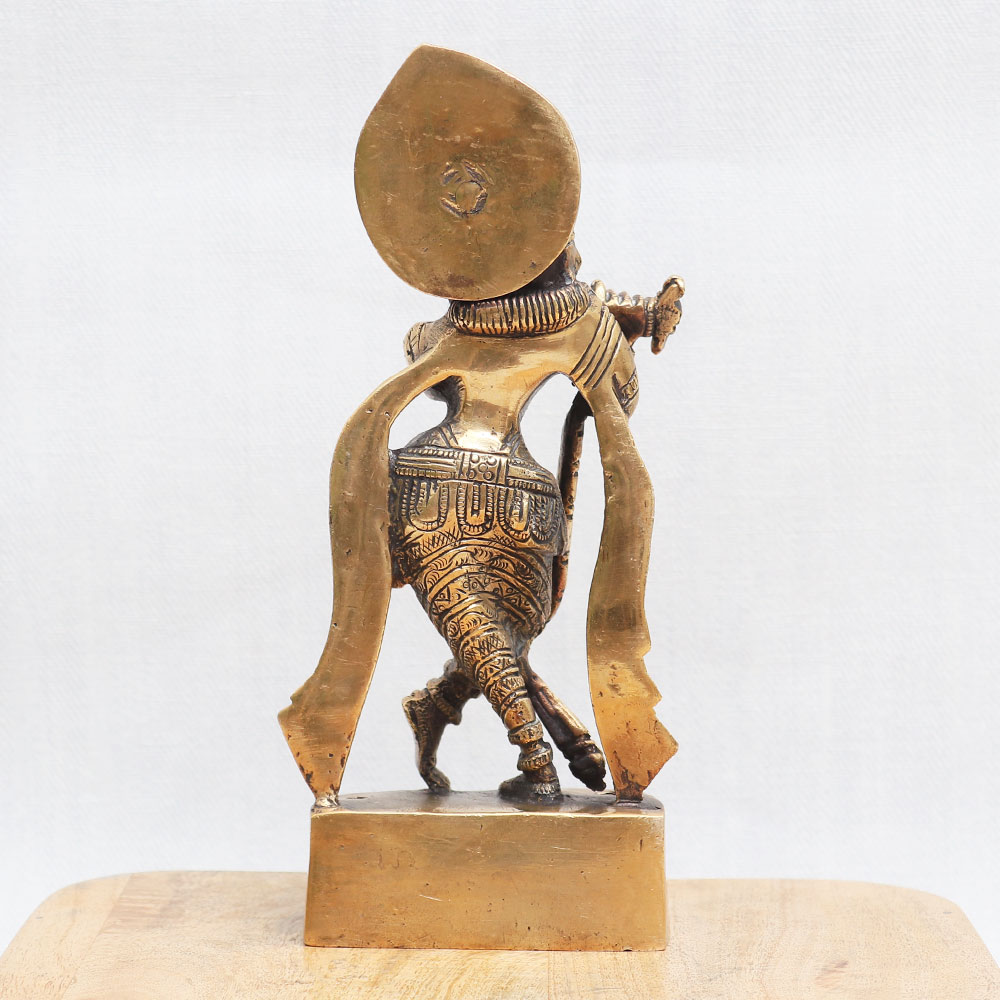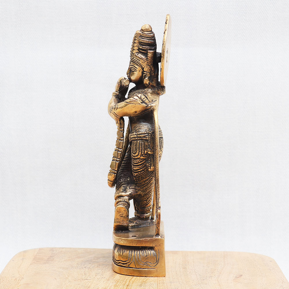 Buy a Lord Krishna Idol online and get a hassle free delivery at your doorstep. Standing elegantly with his legs crossed and playing the enchanting flute, Lord Krishna emanates a sense of tranquillity and devotion. Crafted with attention to detail, this statue showcases the craftsmanship of highly skilled Indian artisans who have brought to life the timeless beauty of Lord Krishna. The antique brown finish adds a touch of antiquity, making it a captivating addition to any interior decor. Ideal for temple worship, this bronze statue can also be used to adorn your home, office, cafe, restaurant, gym, or hotel temple, infusing the surroundings with an aura of spirituality. As you explore statue online, this Indian god statue holds a prominent place among the collection of god idols for home. It serves as an auspicious gift, perfect for presenting to your loved ones on special, festive, or auspicious occasions. Embrace the divine essence of Lord Krishna and elevate the ambience of your space with this sacred bronze statue.