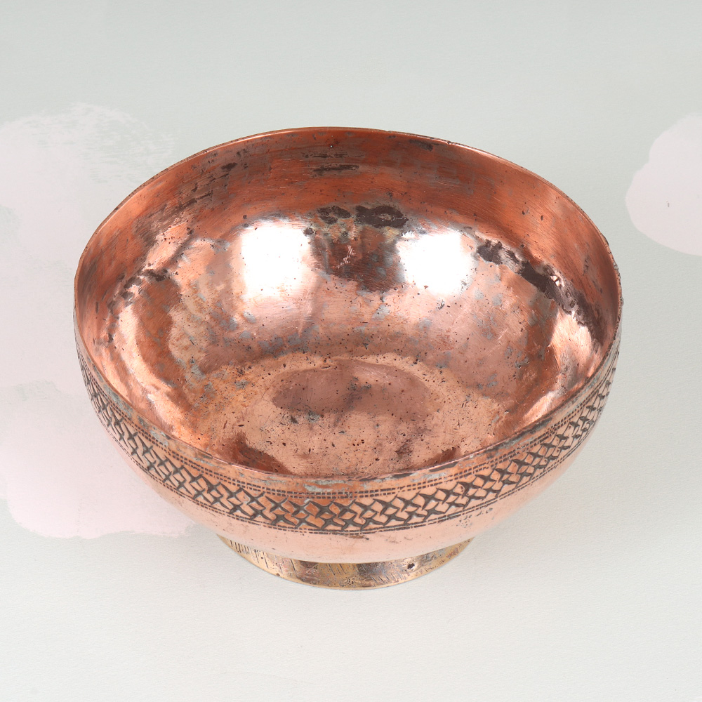 Prepare to be captivated by the stunning beauty of this vintage copper Islamic bowl, a masterpiece of Peshawari art. Crafted with meticulous attention to detail, this exquisite piece is a true testament to the rich cultural heritage of the region, blending intricate designs with the warm, inviting glow of copper. Step into the vibrant world of Peshawari art and let this vintage copper bowl transport you to the bustling streets of Pakistan. Display it prominently in your home, and let its mesmerizing patterns and warm metallic tones captivate your guests. Whether you're a collector of fine art, a lover of global design, or simply seeking to add a touch of cultural richness to your living space, this stunning bowl is the perfect addition. Imagine the conversations and admiring glances it will spark, as friends and family marvel at the intricate details and the captivating history behind this remarkable piece. Elevate your home decor and immerse yourself in the timeless beauty of Peshawari craftsmanship with this exquisite vintage copper Islamic bowl.