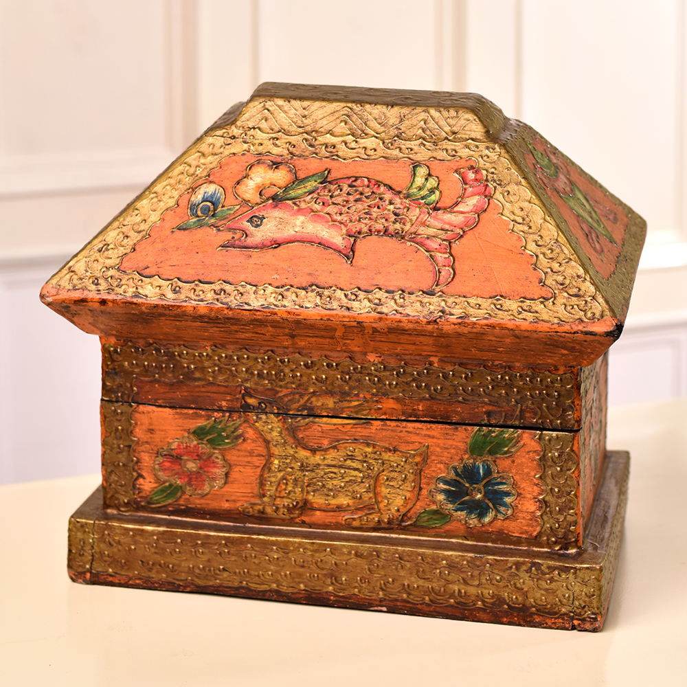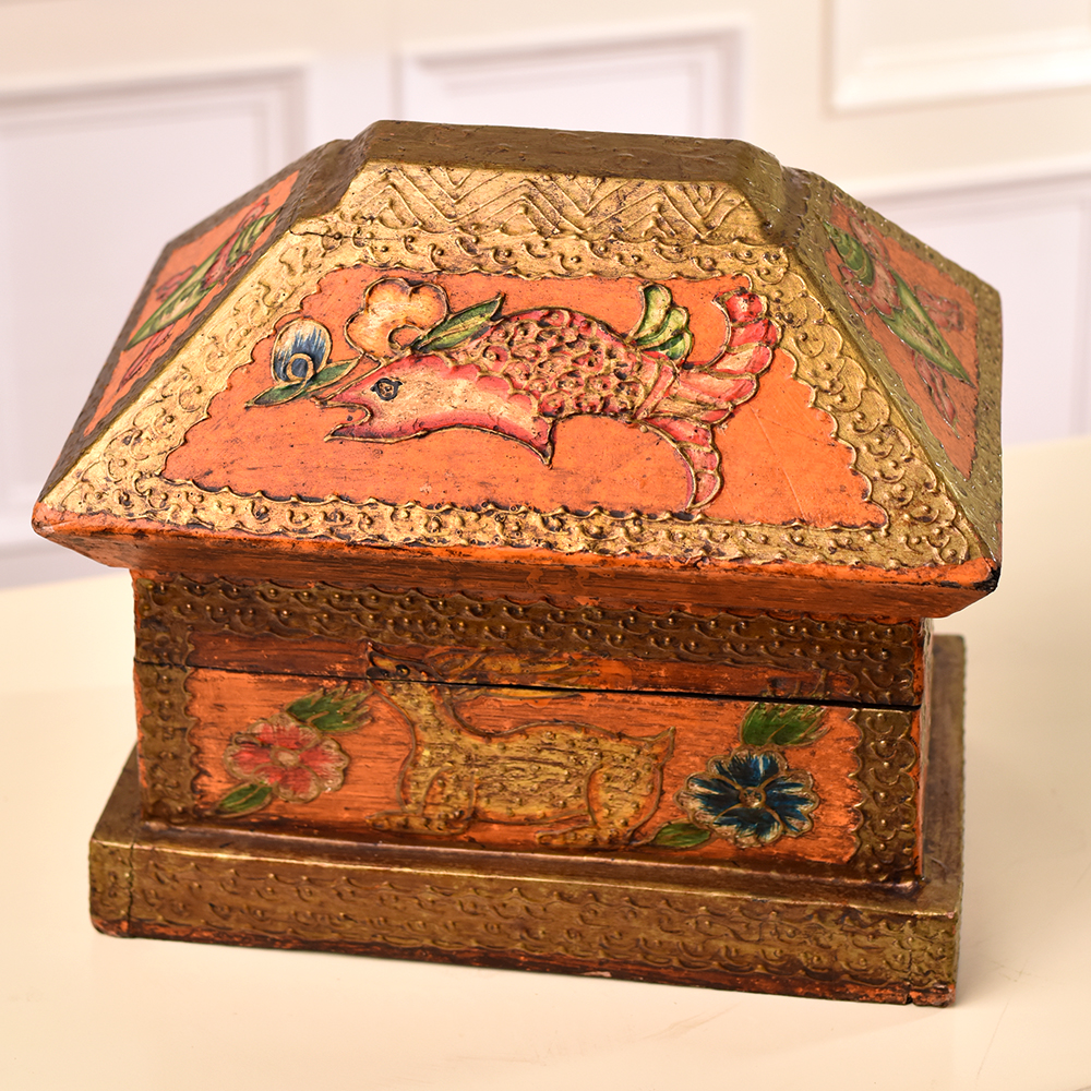 Immerse yourself in the exquisite craftsmanship of this multi-coloured wooden box which is a testament to the skill and artistry of Indian artisans. Handmade with precision and care, the box features intricate engravings of fish, animals, and floral motifs, each telling a story of tradition and heritage. Crafted from high-quality wood, this box not only serves as a stunning jewelry organizer but also as a cherished repository for small treasures. The vibrant hues dance across the surface, adding a touch of elegance to any space. Display it at exhibitions to showcase the rich tapestry of Indian craftsmanship, drawing admiration for its detailed design and meticulous execution. Beyond its visual allure, this box becomes a heartfelt gift for your family, friends or relatives on special or festive occasions - a tangible expression of your appreciation for beauty and culture. Unveil the magic within this wooden masterpiece, where tradition meets contemporary utility in a celebration of art and functionality.