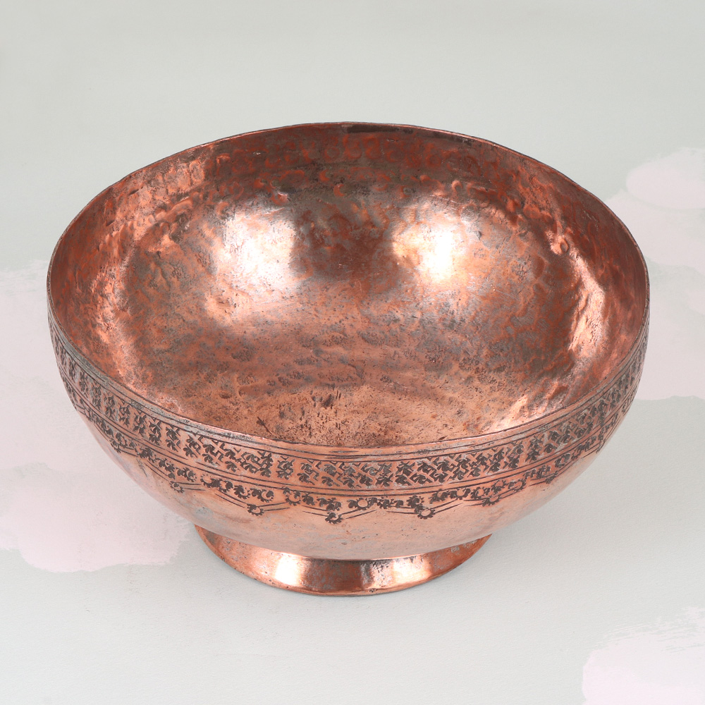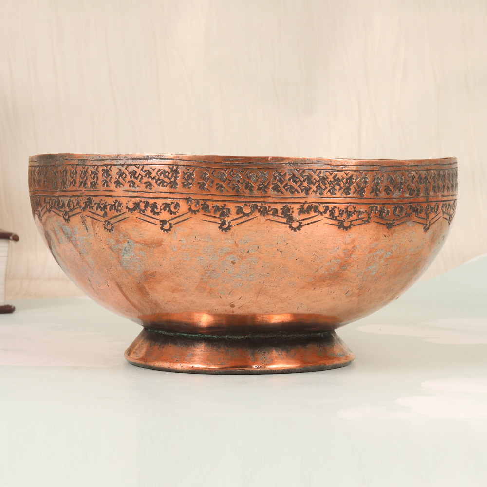 Elevate your home decor with the captivating allure of this vintage copper Islamic bowl, a masterpiece of Peshawari Art. Crafted with uncompromising attention to detail, this bowl is a testament to the enduring legacy of Islamic artistry. More than just a decorative item, this copper bowl is a window into the rich cultural heritage of the Peshawari region. The mesmerizing design was meticulously etched by master artisans, each line and curve reflecting their unparalleled skill and dedication. Whether displayed prominently or used for everyday tasks, this bowl will infuse any space with a sense of timeless elegance. Imagine the joy of owning a piece that seamlessly blends form and function, utility, and artistry. This vintage copper bowl is the perfect gift for the discerning aesthete in your life, a tangible representation of the enduring beauty of Islamic craftsmanship. Its captivating presence will elevate the ambiance of any room, inviting guests to appreciate the intricate details and cultural significance that imbue this exceptional piece.