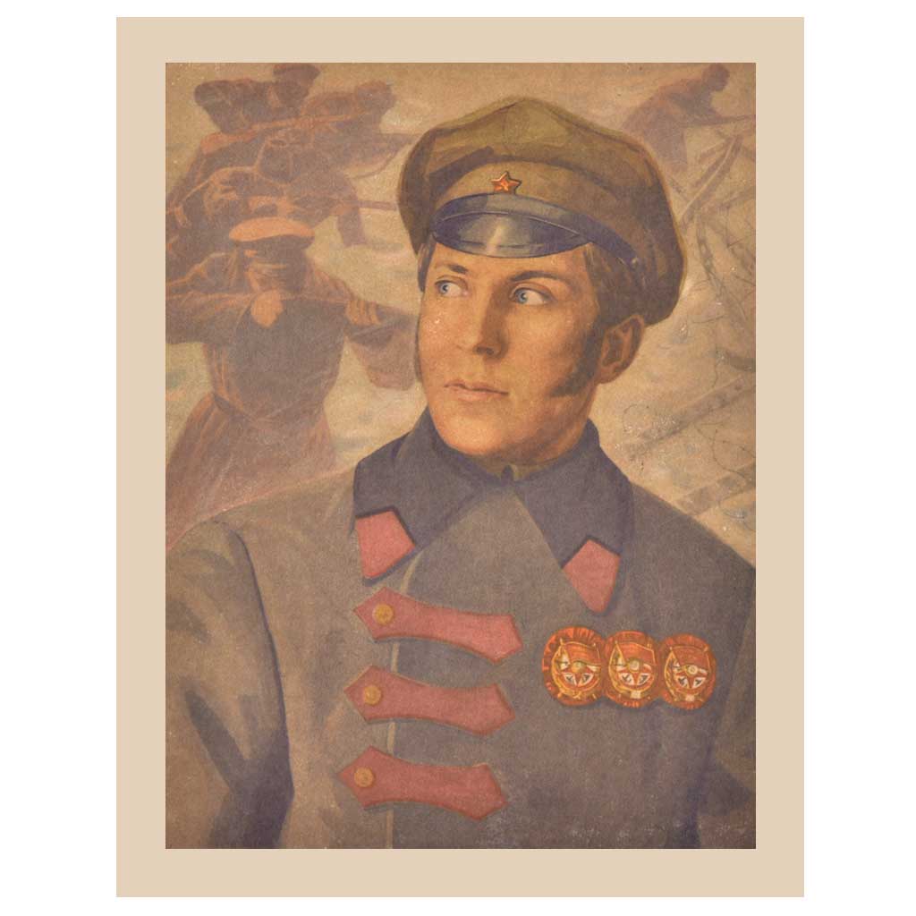 The photo shows an image of an officerdressed in proper uniform with a war scene in the background . Soliders with rifles who are in his regiment seem in an attacking position.The officer shows him posing for the painting with cap that has a badge of the German army.