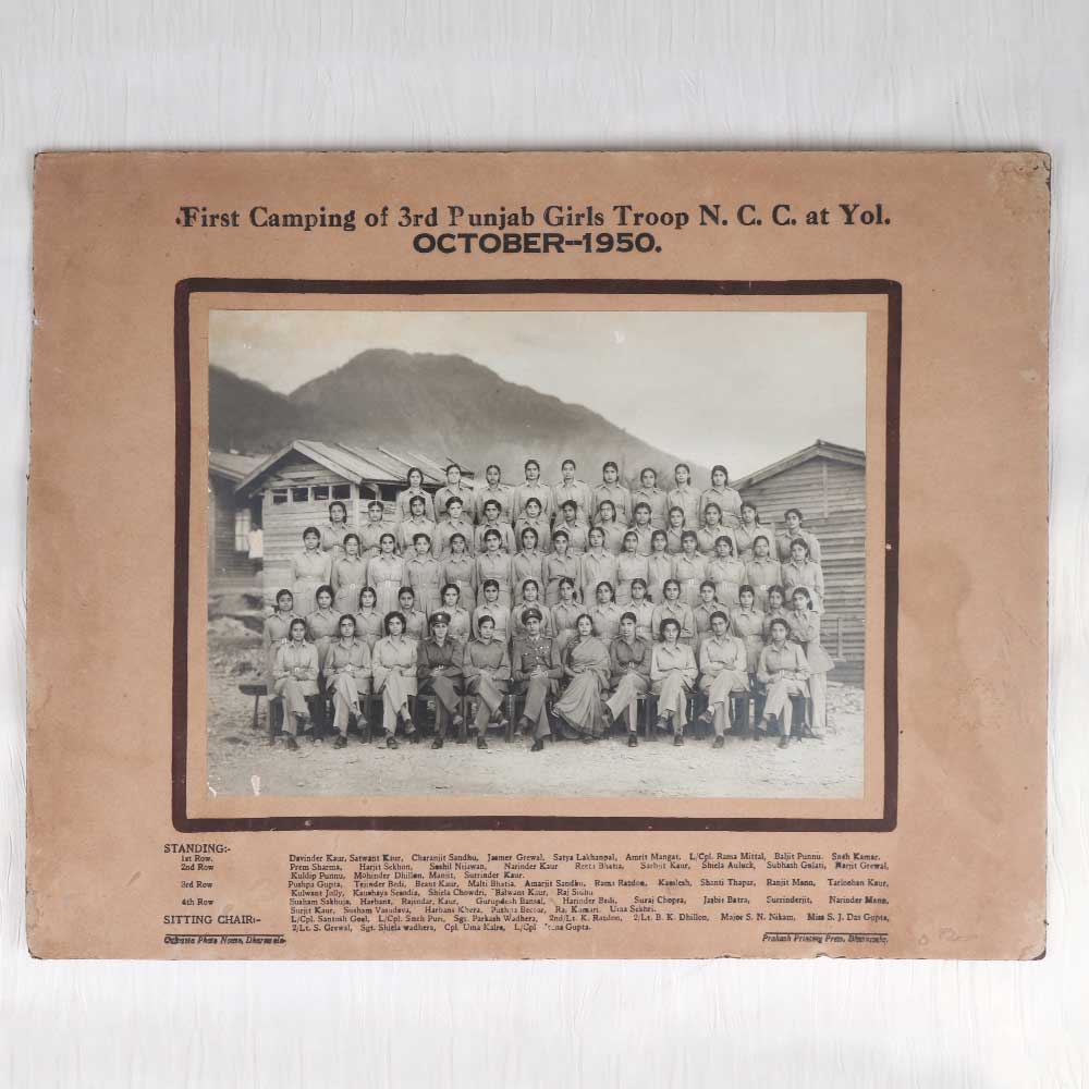 Relive an exciting moment in history with this one-of-a-kind vintage photograph from October 1950. Showcasing the "First Camping of 3rd Punjab Girls Troop N.C.C. at Yol.", this black and white group photo provides a window into a pioneering all-girls troop. As the smiling young cadets line up neatly in their uniforms, you can envision their pride at being part of the National Cadet Corps' first-ever girls camping trip. This photograph preserves an inspiring piece of women's history, capturing a troop of trailblazers stepping boldly into a new experience. For collectors and history buffs alike, it's a chance to own an original artifact from a noteworthy moment. Whether displayed in your home or gifted to a loved one, this vintage image tells a powerful story of adventure and progress. Let it take you back in time.