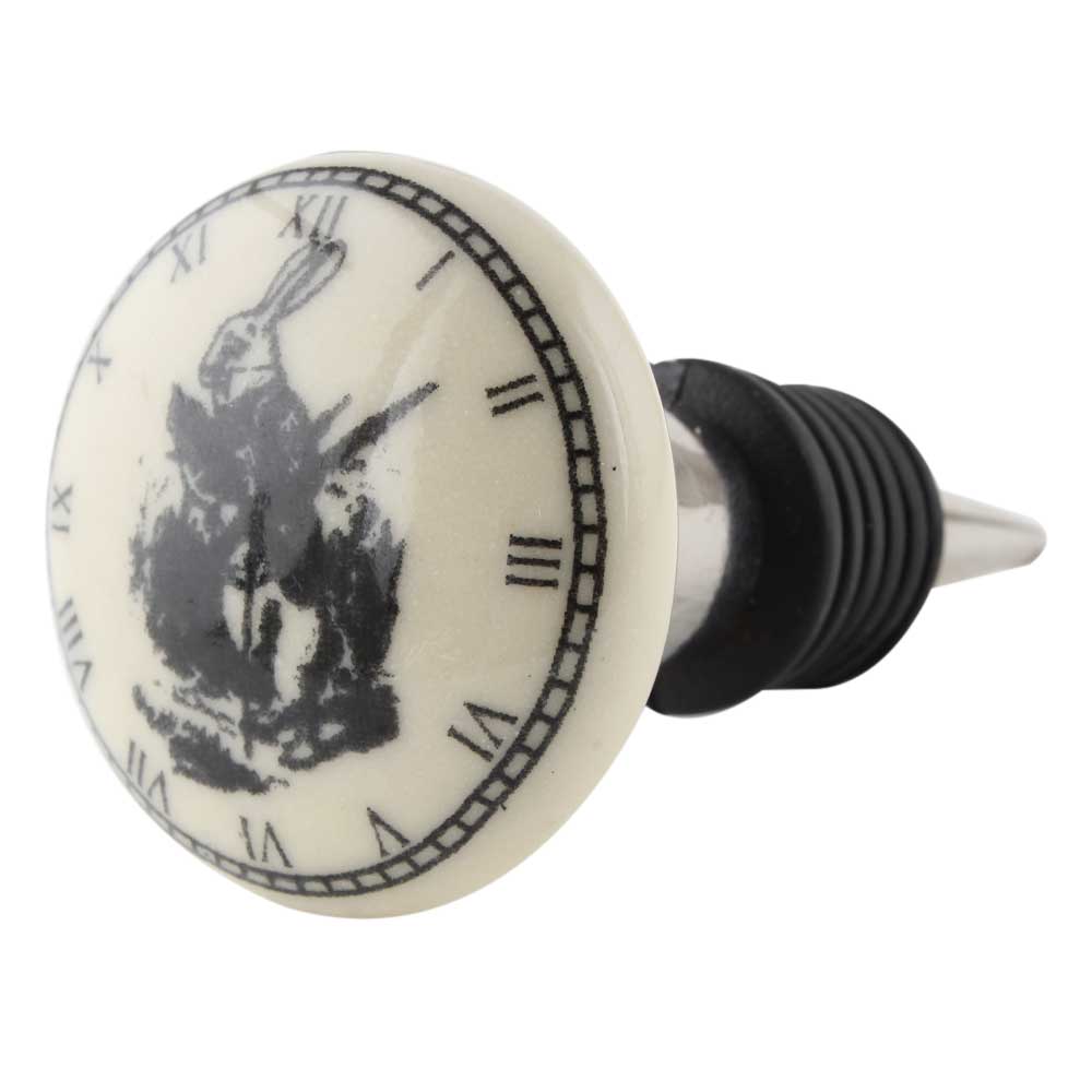 Rabbit Clock Ceramic Flat Wine Bottle Stopper. Zinc Alloy Wine Bottle Stopper with Attractive Jute Bag Packaging.