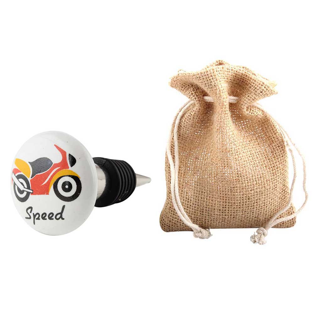 Racer Bike Flat Ceramic Wine Bottle Stopper . Zinc Alloy Wine Bottle Stopper with Attractive Jute Bag Packaging.