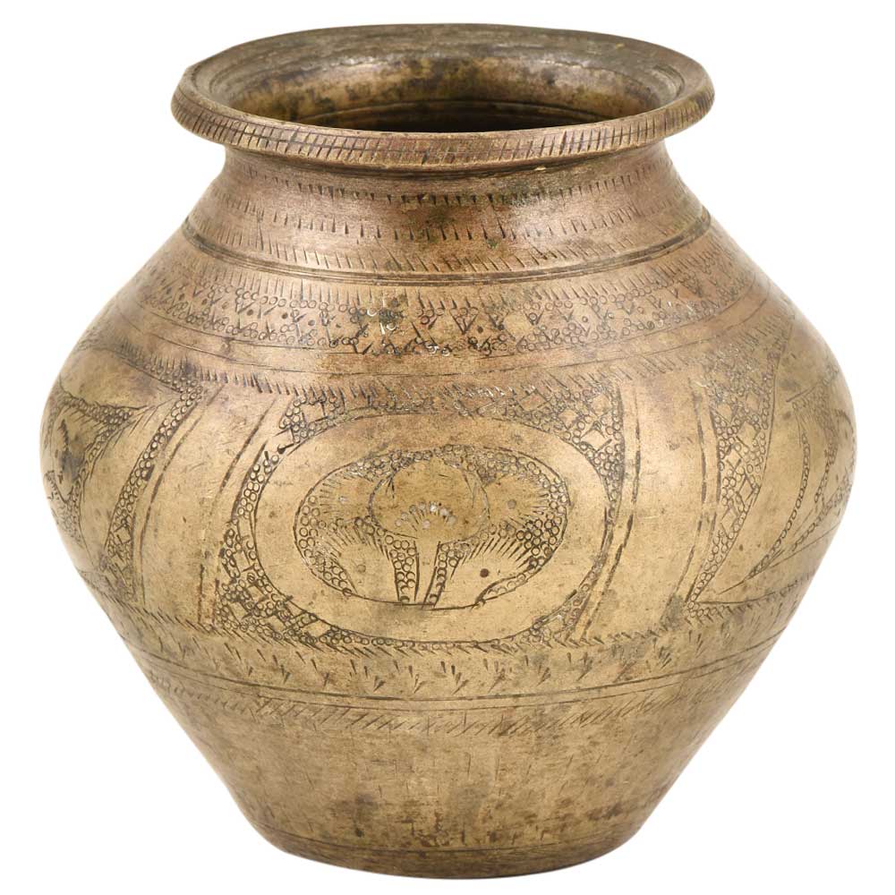 An old brass floral engraved holy water pot that is slightly broad at the centre and narrow near the neck and bottom of the pot. This decorative old brass pot would make a lovely shelf ornament, flower pot or table display.
