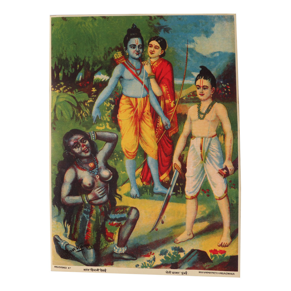 Surpanakha met Rama, Sita, and Lakshman at Panchavati while she was looking for a husband. She was enthralled by Rama's attractive figure. She approached him in the guise of a stunning woman, but Rama informed her that He was already married. Surpanakha, feeling defeated, went to Lakshman, but he sent her away, telling her that he was only Rama's servant. Her true angry demonic form emerged in the wake of this second rejection. She believed that Mata Sita's presence was the cause of her rejection. She moved quickly to eat Mata Sita. She was attacked, and Lakshmana hacked off her nose.