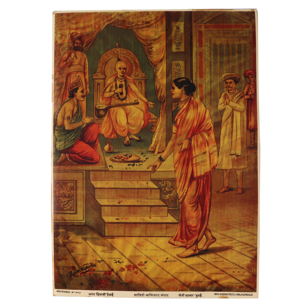 Ravi Raja Varma one of the best of the numerous ideal female figures that the older Indian epic poetry has produced is Savitri, as told in Paper Print of Savitri by Narad Samvad. Savitri, the daughter of Madra's king Açvapati, picks Satyavat, the attractive and noble son of a blind exiled monarch who lives in a woodland hermitage, as her husband. Despite being forewarned by the sage Narad that the prince will only survive for one year.
