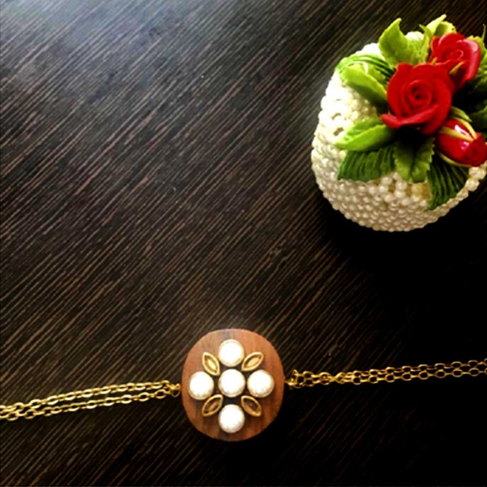 Rakhi - Wooden center piece with hand work along with antique finish gold chain.