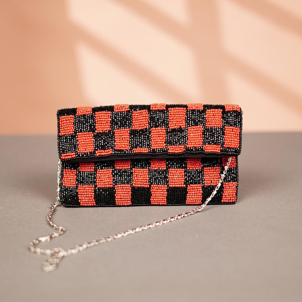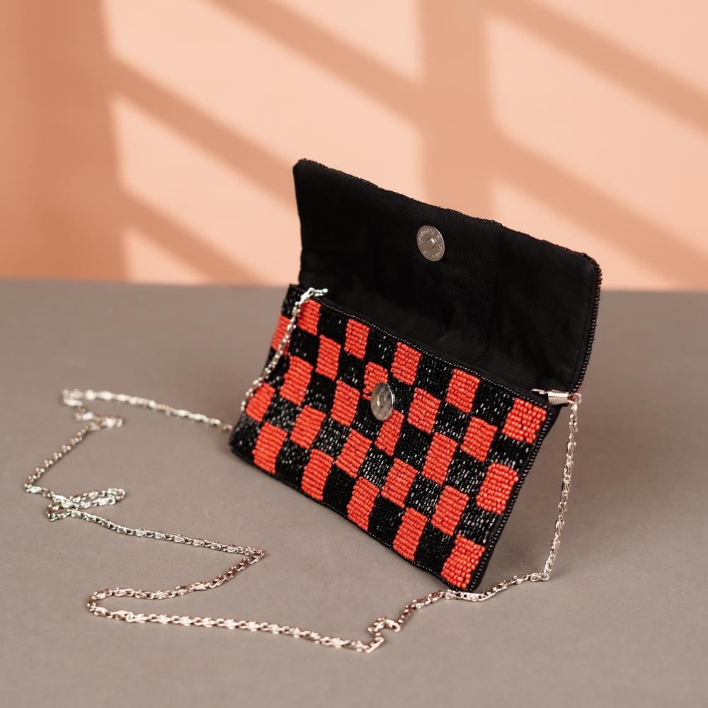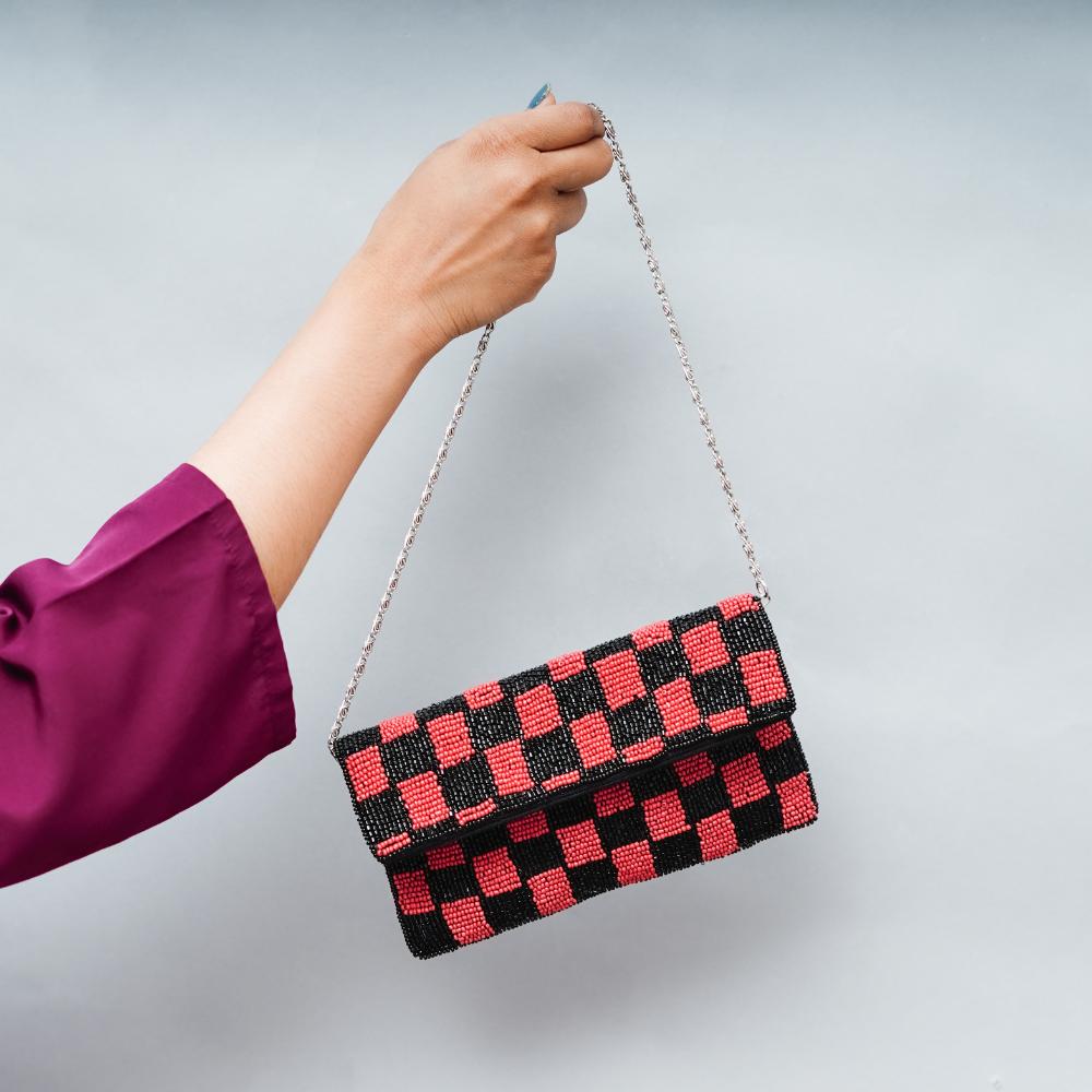This handmade cotton and beaded handbag strikes the perfect balance between fashion and function. Designed for modern elegance, the red and black checkered beadwork adds a pop of character to any outfit. Made from strong cotton fabric and detailed with tiny hand-sewn beads, it reflects the patience and skill of artisan craftsmanship.
