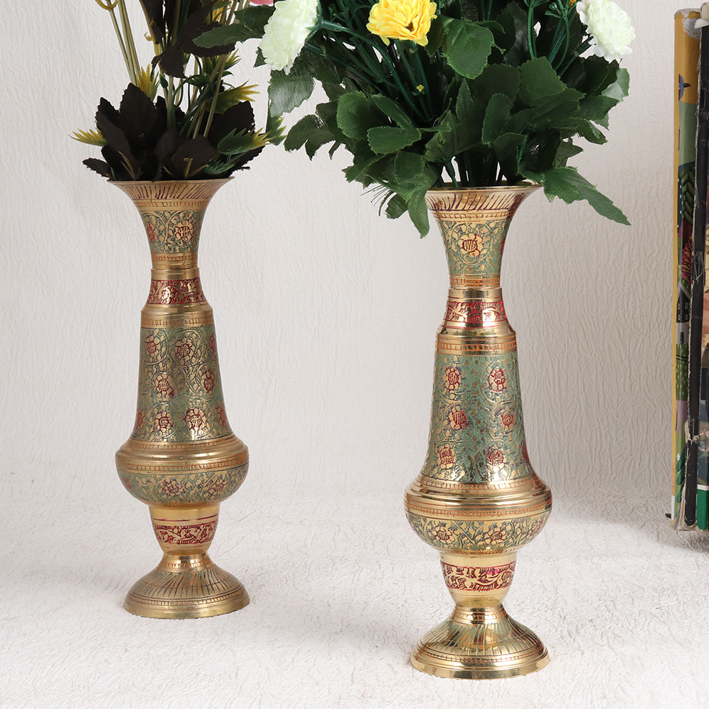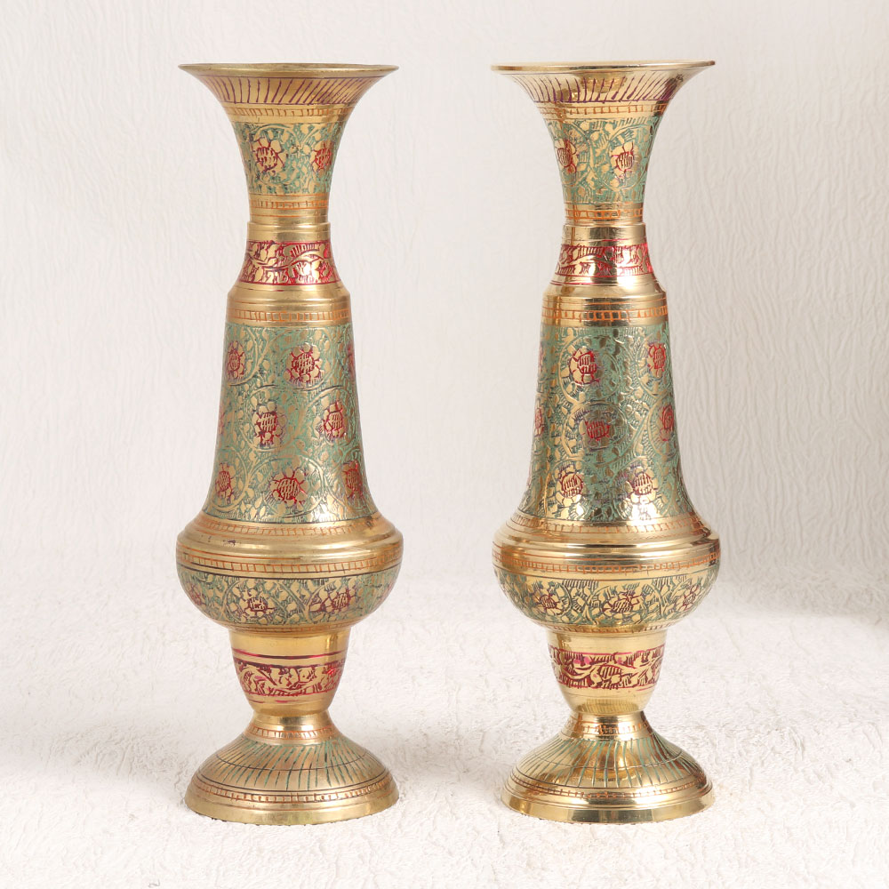 Enhance your interior decor with the timeless charm of these exquisite brass flower pots that are handcrafted by skilled Indian artisans. Each set includes two charming pots, adorned with intricate red and green enamel work, set against an antique golden finish. The meticulous craftsmanship ensures that each piece is a unique work of art, perfect for adding a touch of elegance to any space. Versatile and visually appealing, these flower pots can be placed in a variety of settings, including your home, restaurant, hotel, office, or cafe. Their captivating design and warm, antique golden finish make them a captivating focal point, whether you use them for fresh blooms or artificial arrangements. These enchanting brass flower pots also make for a thoughtful and symbolic gift, suitable for special, festive, or auspicious occasions. Surprise your family, friends or relatives with a piece of Indian artistry that not only brings beauty but also carries a rich cultural heritage. Embrace the grace and craftsmanship of these brass flower pots and infuse your surroundings with a touch of Indian elegance.