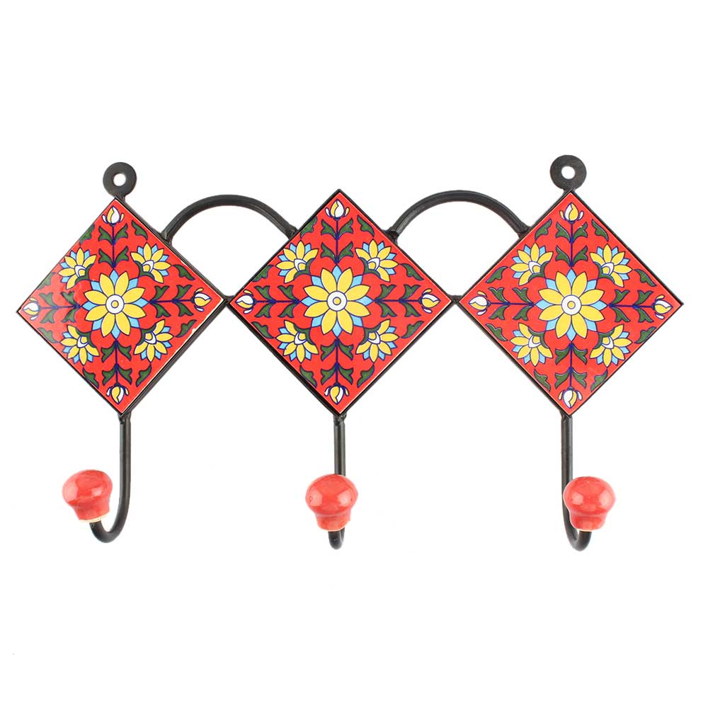 Red Base Yellow Sunflower Ceramic Tile Hook. When Put on Wall or Cabinet It is An Art in Itself. The Metal Part of this Hook is Black Powder Coated.