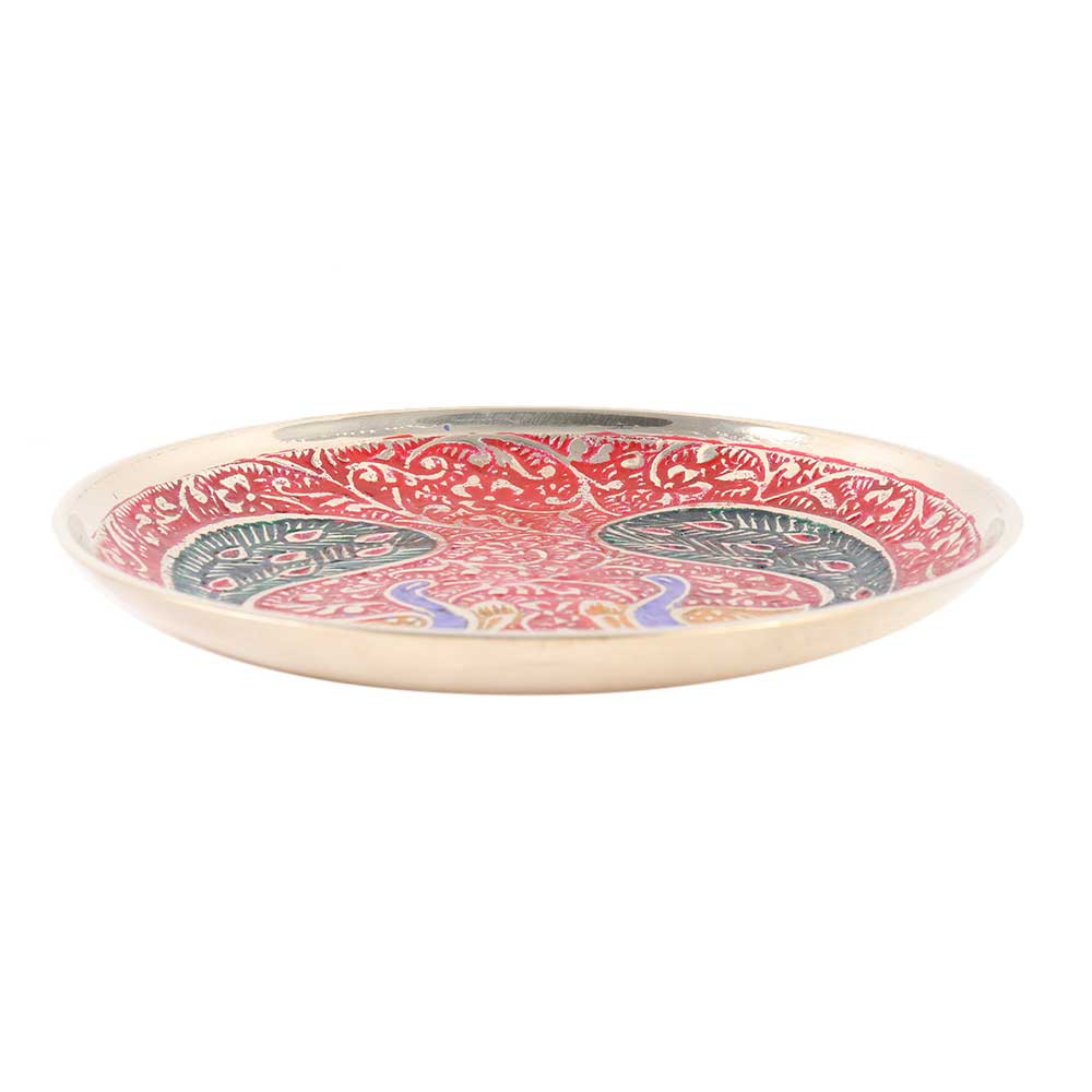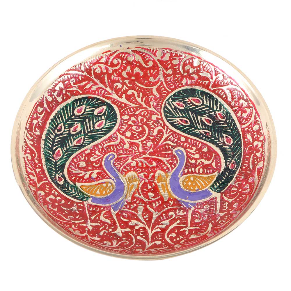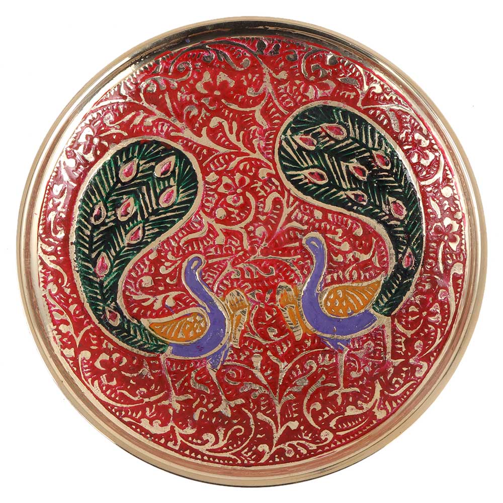 This brass meenakari handcrafted coaster with twin peacock motif on a red base has lovely and vibraint colors. This art is commonly utilised for home decor products, jewellery, and so on. With these Handmade Indian Metal Painted Coasters, you can add a trendy touch to your home's design while keeping your furniture at its best.