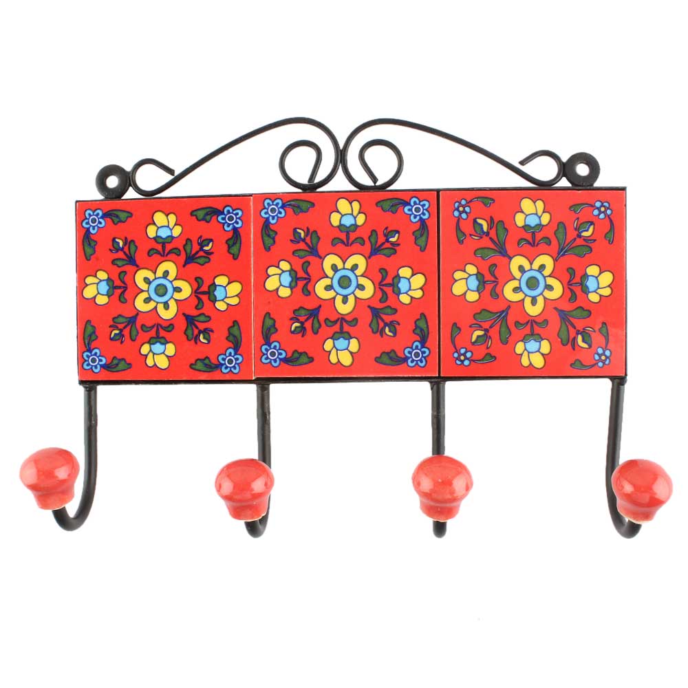 Red Ceramic Tile Hook in Yellow Tiny Flower. When Put on Wall or Cabinet It is An Art in Itself. The Metal Part of this Hook is Black Powder Coated.