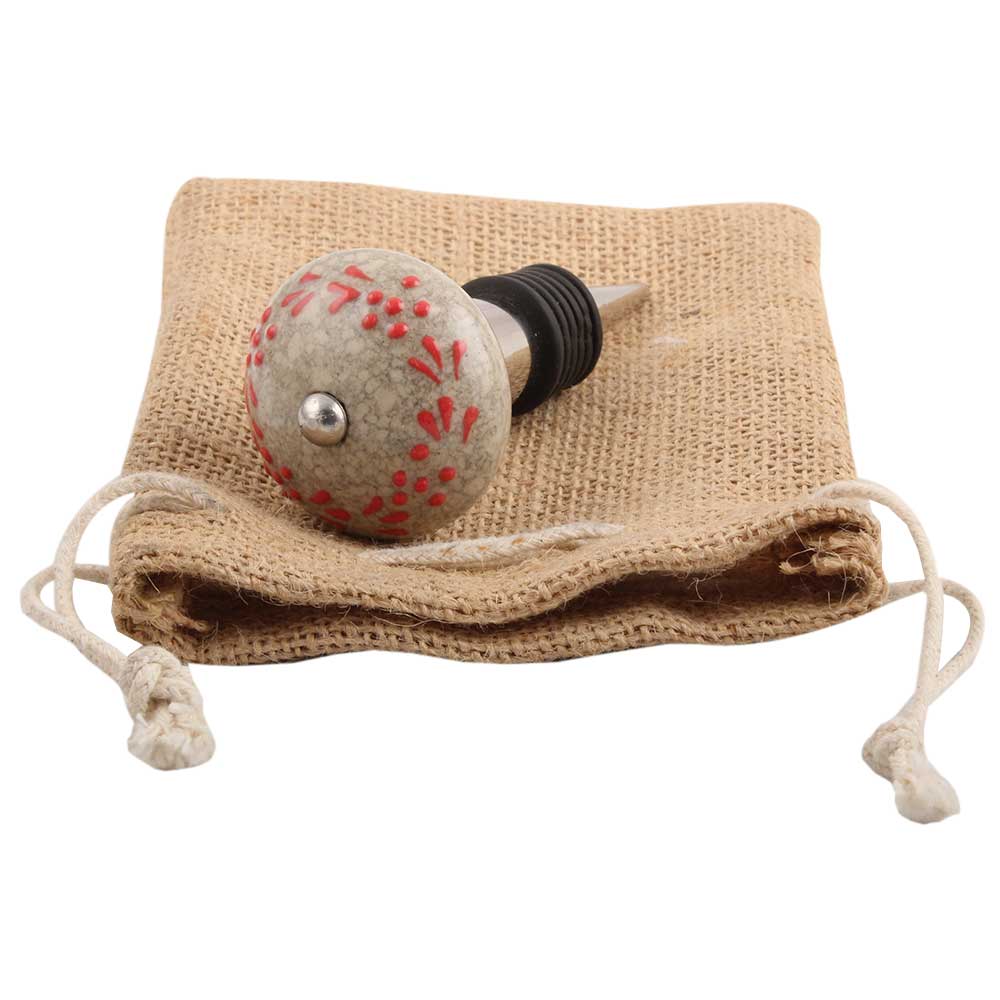 Red Embossed Crackle Ceramic Wine Stopper.zinc alloy wine bottle stopper with attractive Jute Bag Packaging.