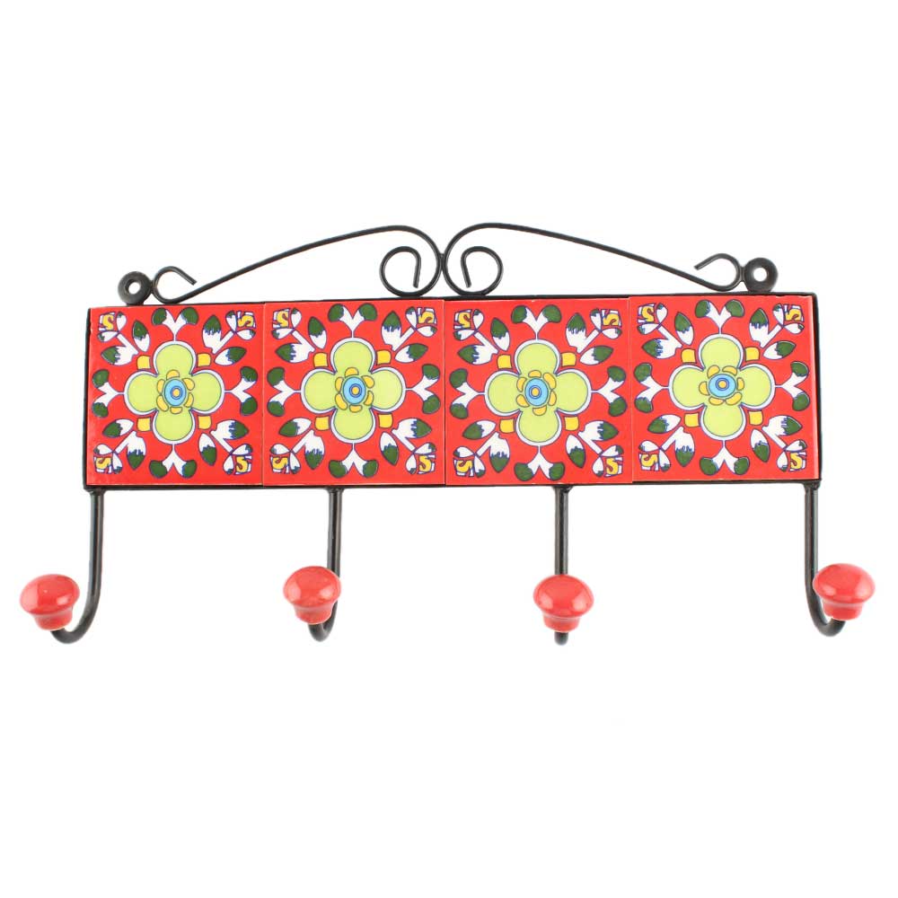 Red Floral Ceramic Tile Hook Online. When Put on Wall or Cabinet It is An Art in Itself. The Metal Part of this Hook is Black Powder Coated.