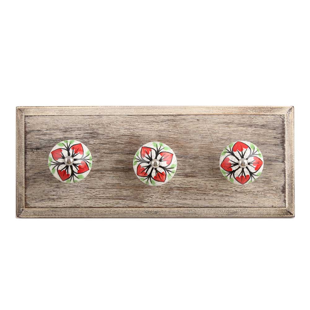 Red Flower Crackle Ceramic Wooden Hook. A Perfect Complement to the Soft Tone of the Wood are these White Traditional Hat & Coat Hook Made of Genuine Porcelain and Brass. It can be use to Hang Jewellery, Leashes, Towels, Scarves, Light Weight Sweaters, Caps Etc.
