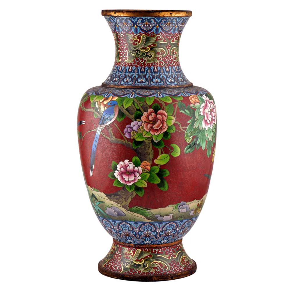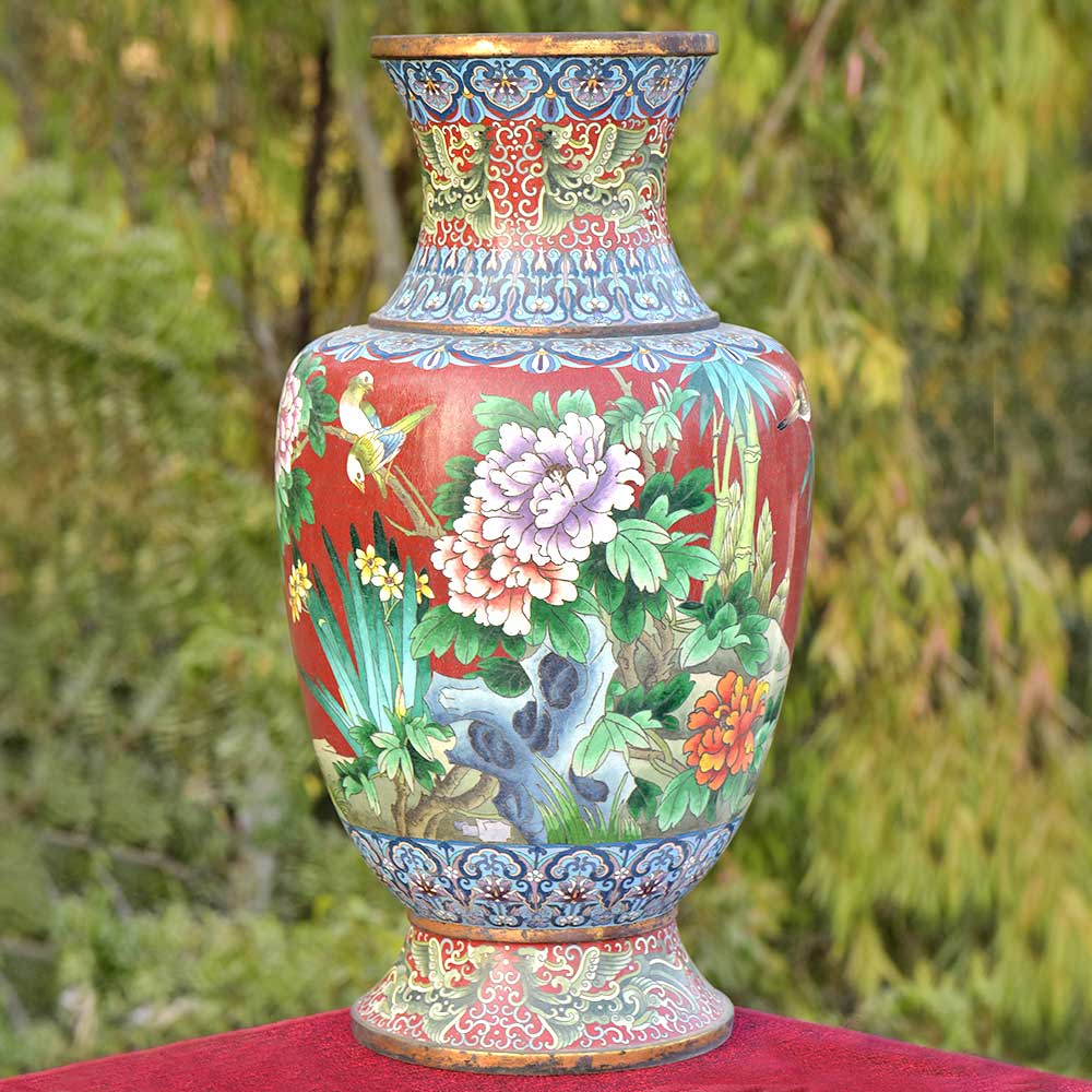 Beautiful cloisonné vase manufactured in bronze and hand painted, has been hand painted in vibrant red, creating an elegant backdrop for the bird and peony flower motif, created by using the Cloisonné technique. Vibrant bird and flower motif make it an elegant showpiece wherever it is placed.