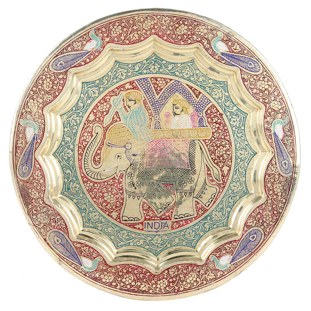 Wall hanging decorative plate made of brass with an elephant on a rider design and wonderful enamel colors. An Elephant figure is carved inside the design of this plate. This plate is used to decorate the inner walls of a home office. This is an excellent vintage present.