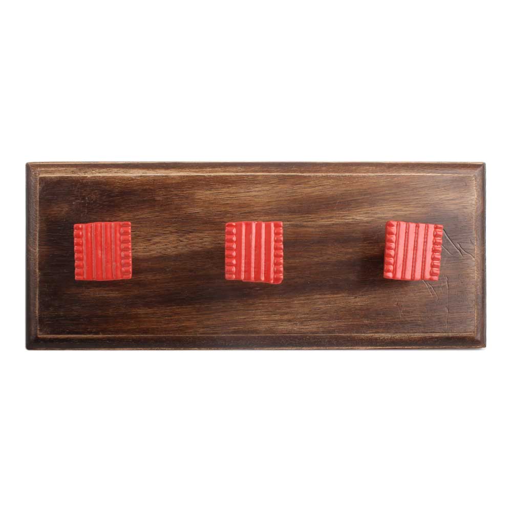 Red Square Border Metal Wooden Hook. A Perfect Complement to the Soft Tone of the Wood are these White Traditional Hat & Coat Hook Made of Genuine Porcelain and Brass. It can be use to Hang Jewellery, Leashes, Towels, Scarves, Light Weight Sweaters, Caps Etc.
