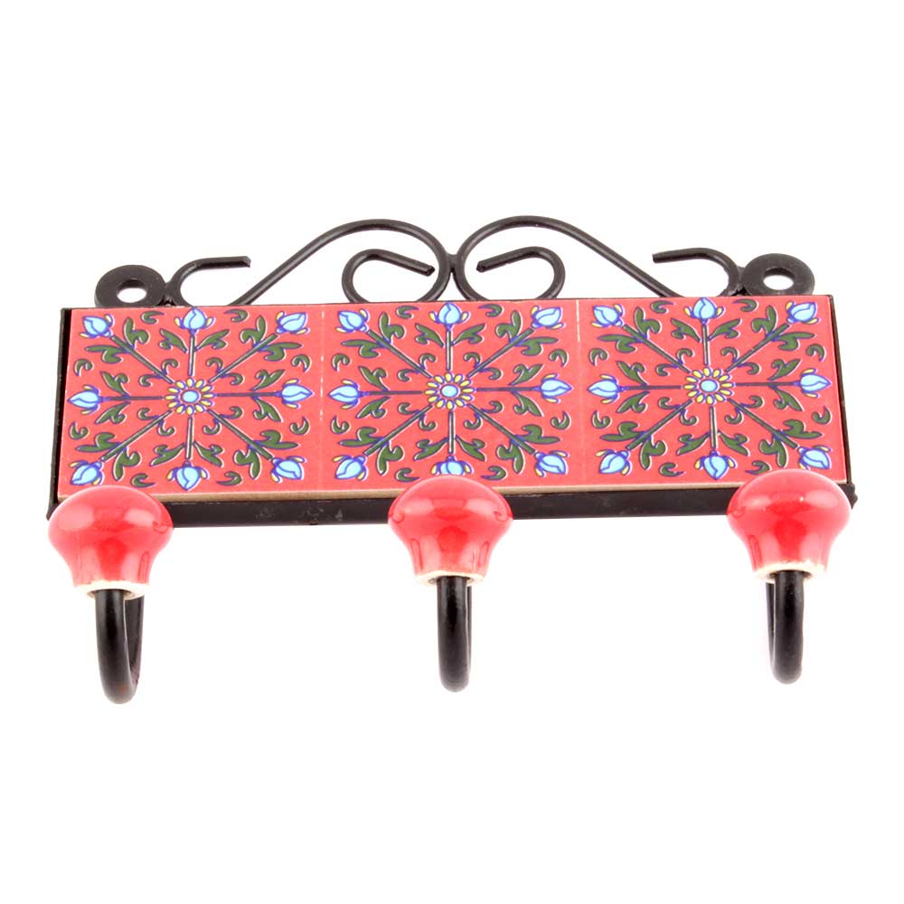 Red Turquoise Tiny Flower Tiles Hooks. WhenPut on Wall or Cabinet it is an Art in itself. The Metal Part of this Hook is Black Powder Coated.
