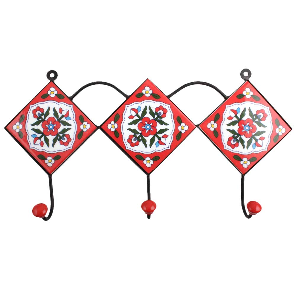 Red White Floral Tiles Hook. When Put on Wall or Cabinet It is An Art in Itself. the Metal Part of This Hook is Black Powder Coated.