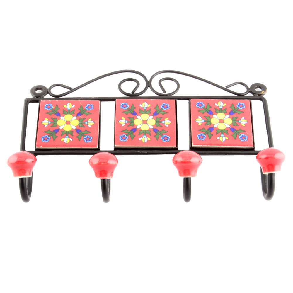 Red Yellow Flower Tiles Hooks. When Put on Wall or Cabinet it is an Art in itself. The Metal Part of this Hook is Black Powder Coated.