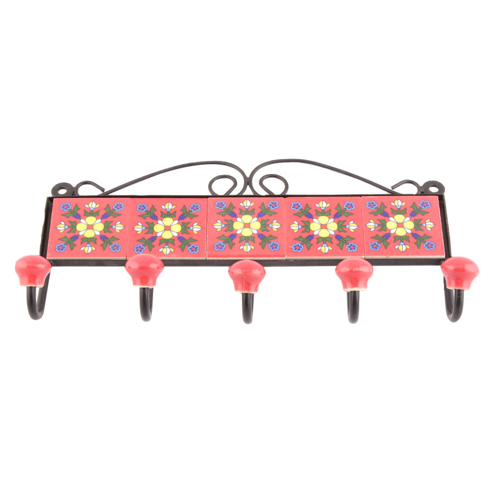 Red Yellow Tiny Flower Tiles Hooks. When Put on Wall or Cabinet it is an Art in itself. The Metal Part of this Hook is Black Powder Coated.